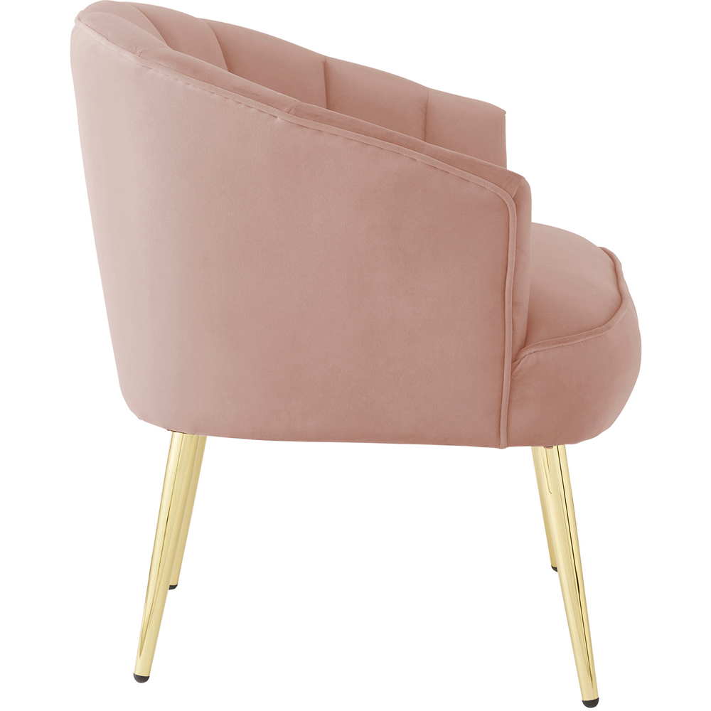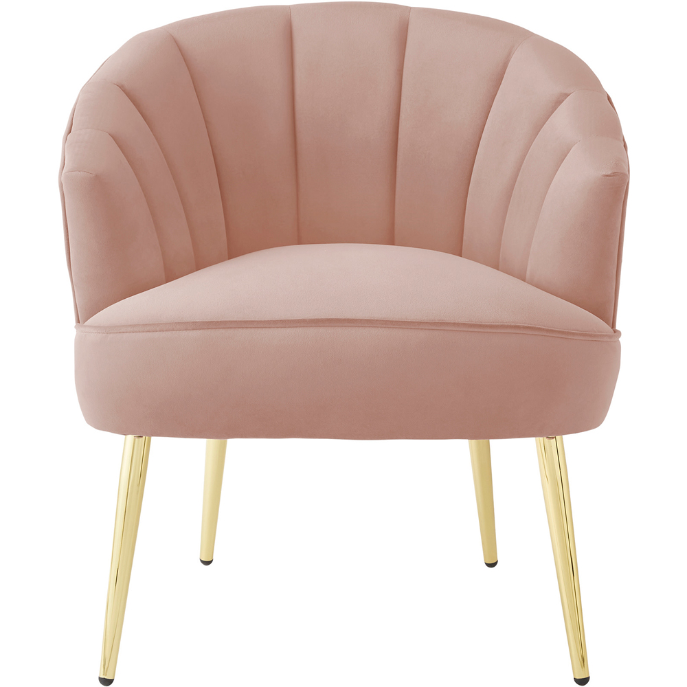 Elevate your home decor with the GFW Pettine Plush Fabric Blush Pink Accent Chair, a masterpiece of design and comfort. With its enchanting scallop shell curves and sumptuous velvet upholstery, this chair offers both visual appeal and lasting cosiness. Complemented by chic golden tapered legs, it presents a captivating contrast that enhances the sophistication of any living area.