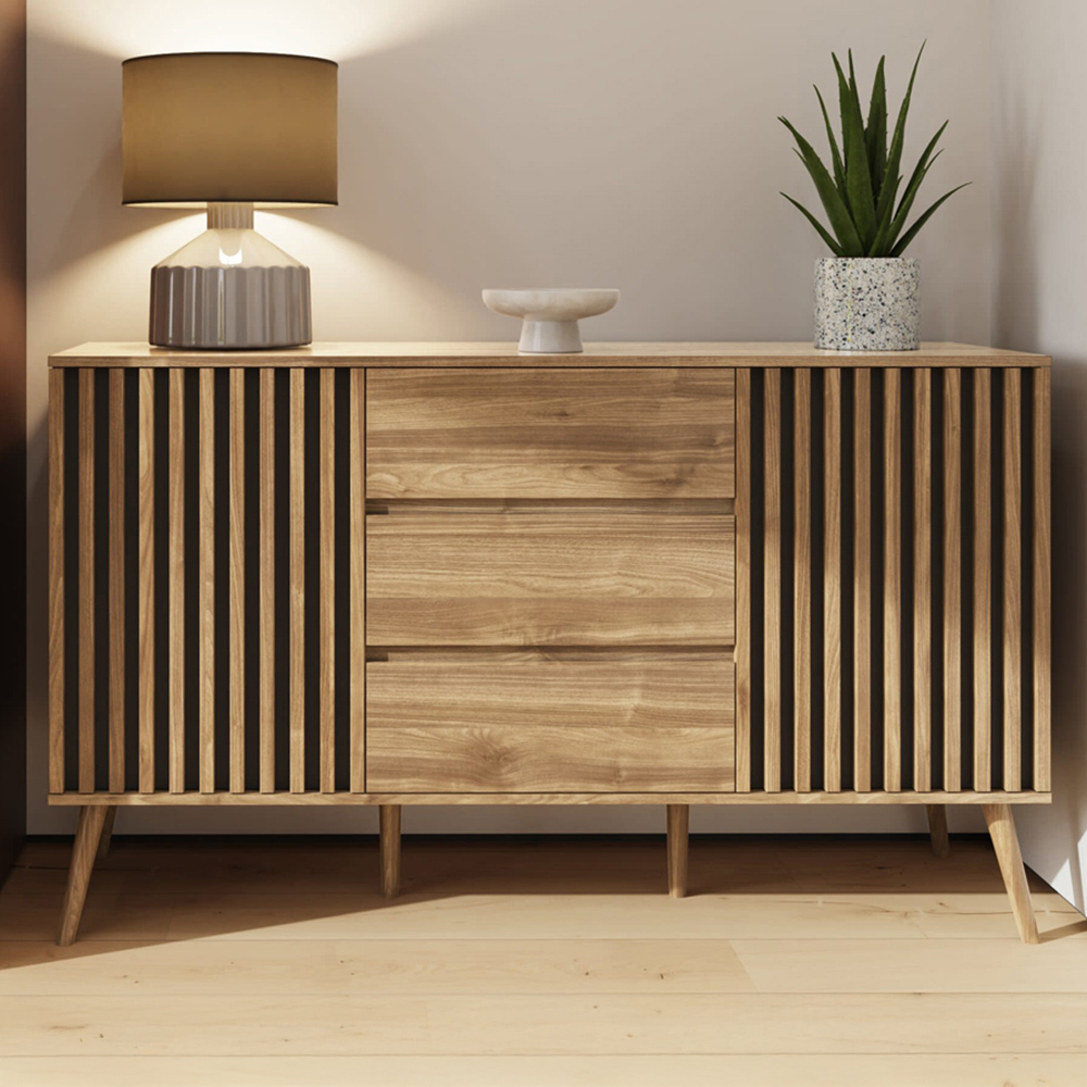 Declutter your space with the GFW Rowan Oak 2 Door 3 Drawer Louvered Large Sideboard. This sideboard perfectly balances style and functionality, featuring a sleek oak-effect finish with unique vertical slat detailing. It offers five spacious storage compartments, providing ample room to organize your essentials. Additionally, the top surface serves as a display shelf for decorative items or everyday use. With its contemporary design, this sideboard adds a touch of elegance to any living or dining area, making it an ideal choice for those who value both aesthetics and practicality in their home furnishings. Please note that all shelving is non-adjustable.