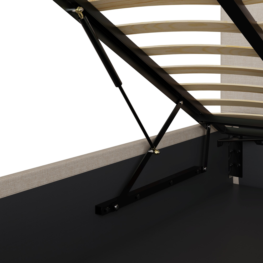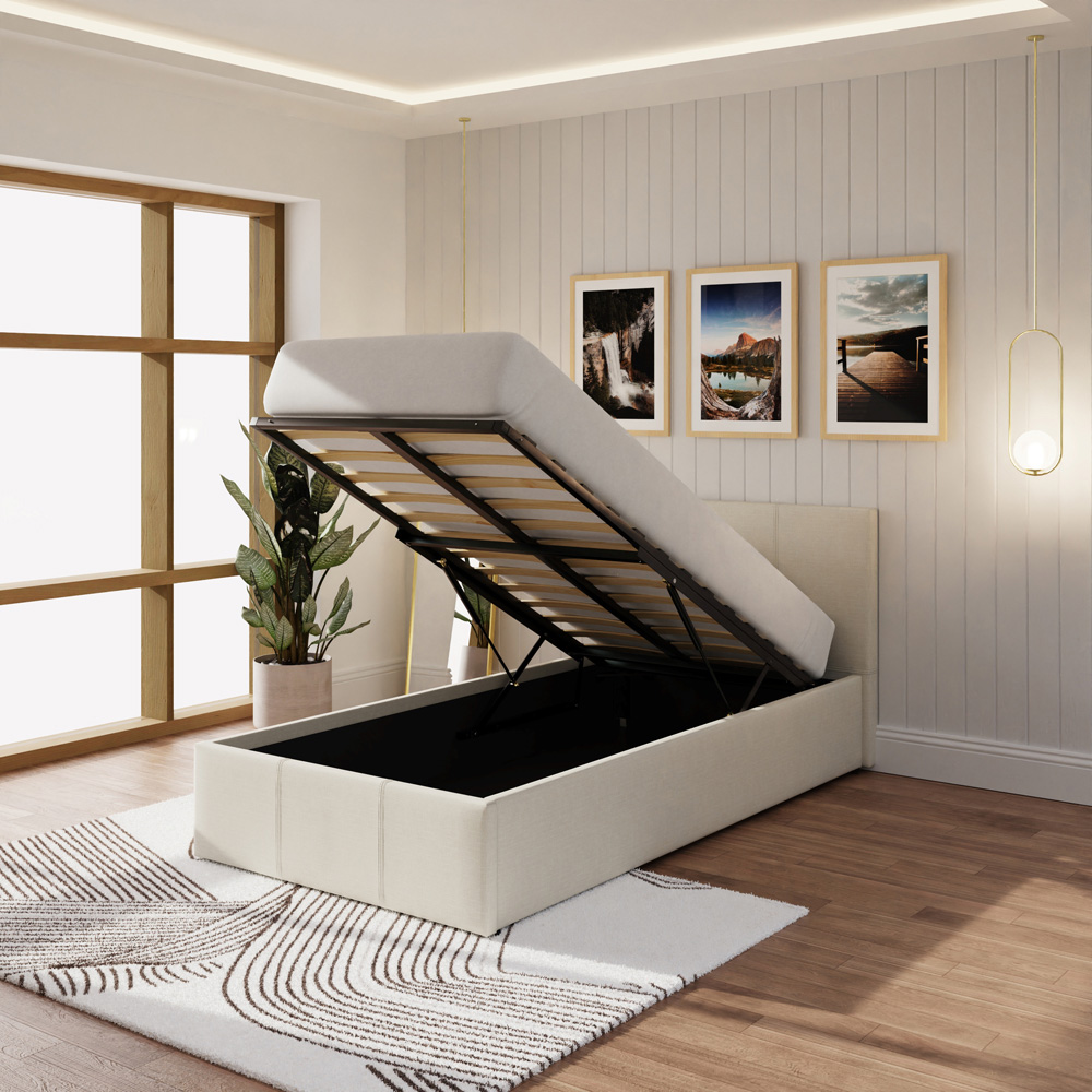 Elevate your bedroom's style and functionality with the GFW Single Natural Ottoman Bed. This single bed boasts a sophisticated design, featuring durable hopsack fabric upholstery for a cosy look and feel with a subtle stitched pattern. The elegant headboard and footboard add a touch of class, while the sturdy slatted mattress base, reinforced with a strong centre support beam, ensures exceptional comfort and stability. Enjoy effortless access to the generous concealed storage space via the smooth gas lift hydraulic mechanism. A perfect blend of practicality and sophisticated design for your bedroom.
