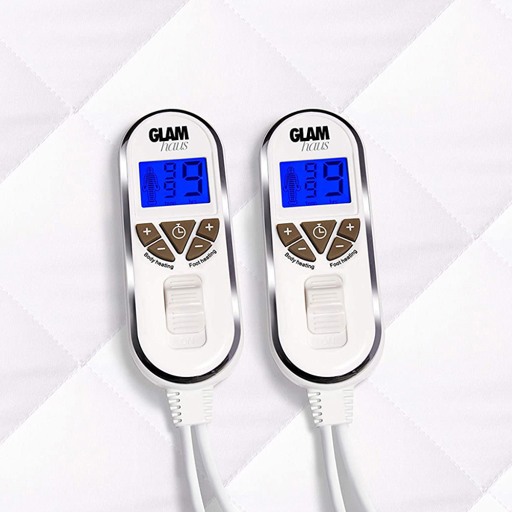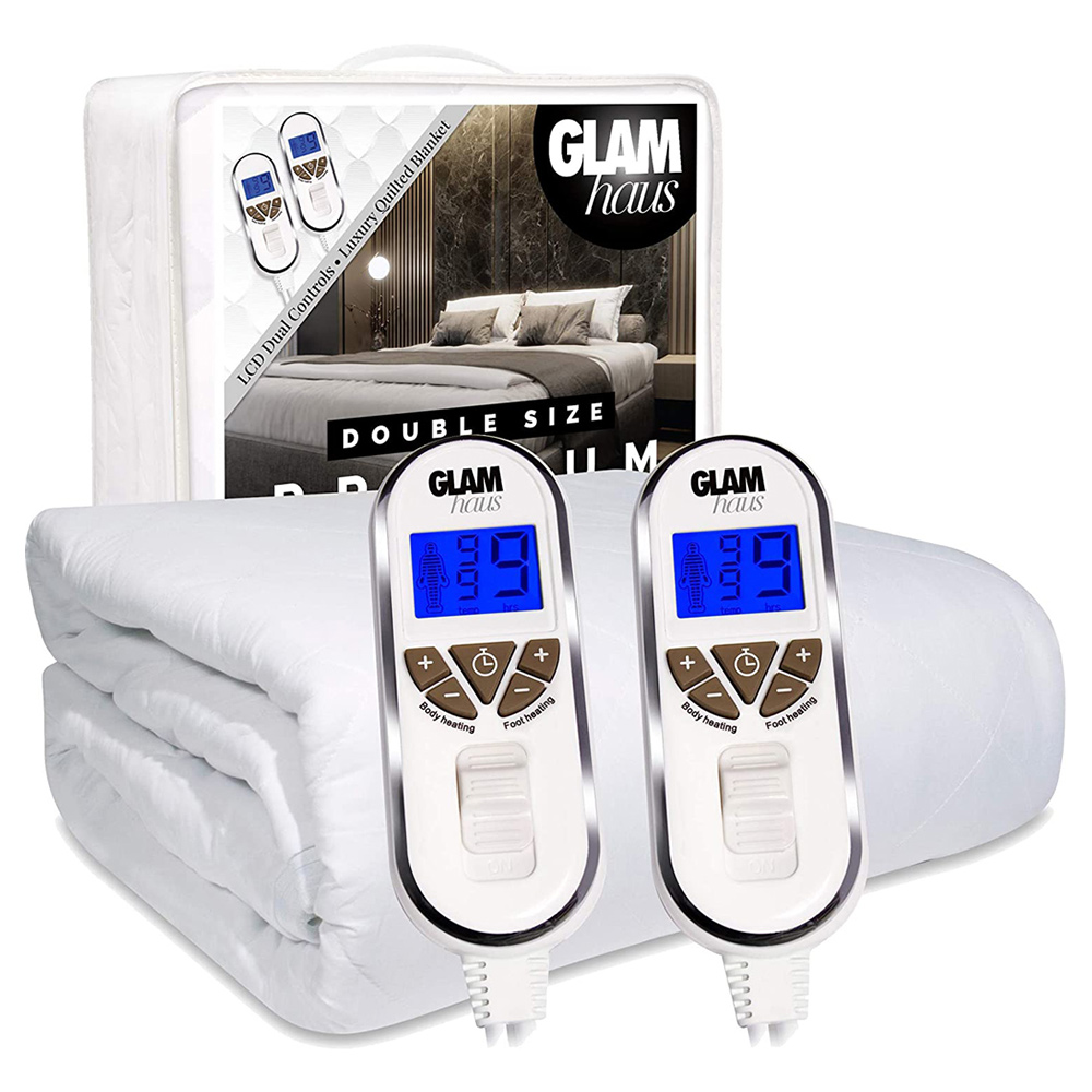 Indulge in ultimate comfort with the GlamHaus Double Fitted Electric Blanket. This meticulously crafted blanket boasts an extra-deep skirt for a perfect fit on most mattresses, preventing any unwanted bunching or shifting. Enjoy personalized warmth with independent temperature control for your body and feet. Choose from nine cosy heat settings, and utilize the convenient countdown timer with nine hourly options or a 12-hour low heat setting. Effortless digital controls make adjusting settings a breeze, while a simple LCD display ensures intuitive operation even for those less tech-savvy. Maintaining hygiene is simple, just detach the power cord and machine wash on a short cold (or 30°C) cycle. Safety is paramount, this blanket meets the highest quality and safety standards, complete with an overheat protection system. Measures 193cm x 137cm.