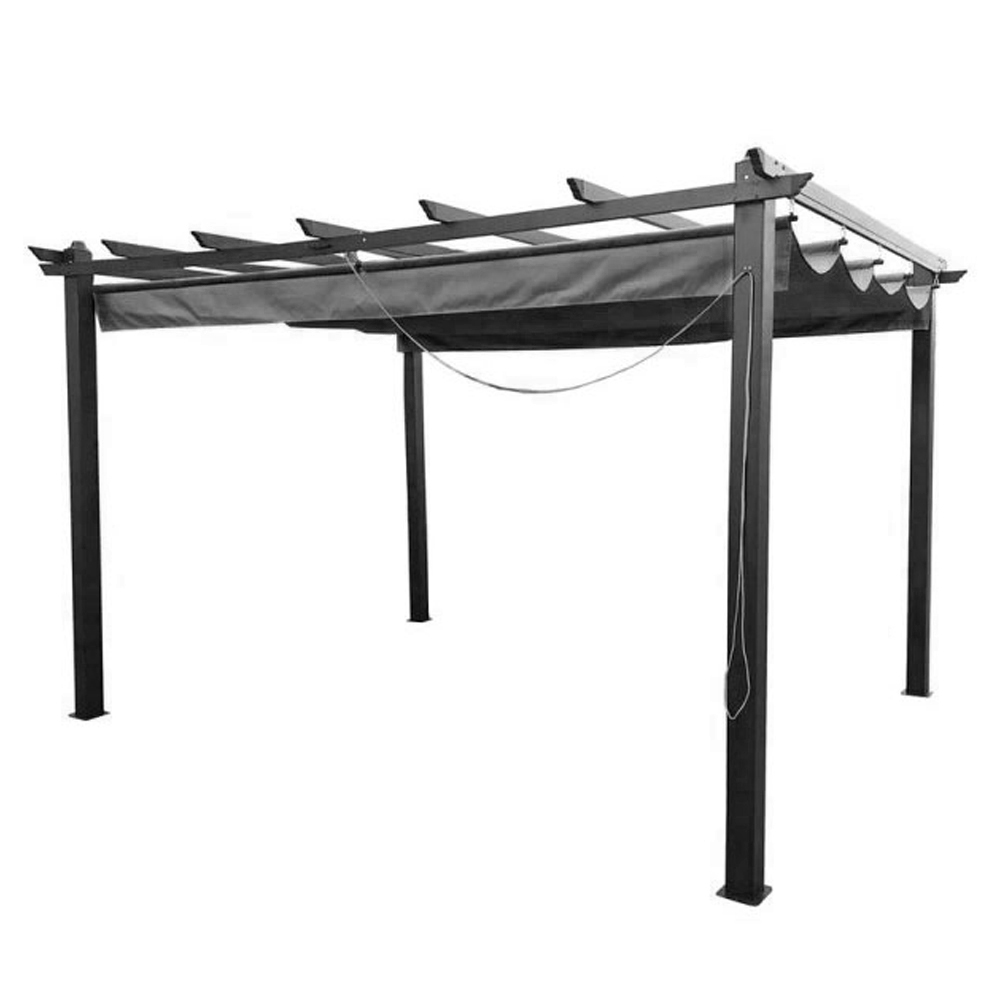 The Glendale Seville Grey Garden Gazebo: a stylish pergola-style shelter that effortlessly blends elegance and practicality. This 4 x 3m gazebo boasts a robust black aluminium frame with powder-coated steel feet and canopy rods, supporting a retractable polyester canopy. The showerproof canopy glides smoothly thanks to an easy-glide mechanism and magnetic hold. Large pre-drilled fixing plates allow for secure, permanent installation in your garden or on a deck. Enjoy shade for garden parties, barbecues, or simply relaxing, knowing this gazebo is built to withstand the elements year-round. For optimal lifespan, remove the roof cover and curtains during winter storage. Home assembly is required.