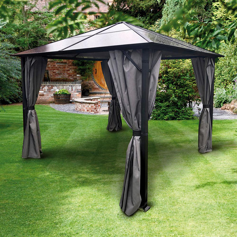 Create the perfect garden oasis with the Glendale Peninsula Polycarbonate Grey Garden Gazebo. This durable, all-weather structure is ideal for year-round outdoor entertaining. Four powder-coated black steel columns, anchored to the ground with heavy-duty fixing plates (pre-drilled for easy installation), provide robust support for the modern polycarbonate apex roof. Enjoy privacy and protection from the elements with the included heavy-duty, UV-stabilised grey polyester curtains. These showerproof curtains are easily removed for cleaning or storage, feature tie-backs, and zip together for added seclusion. Minimal maintenance is required. Assembly is straightforward and can be completed by two people. Size: 2.5 x 2.5m.