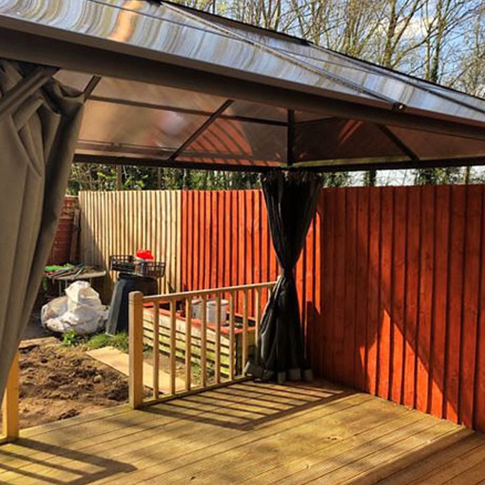 Enjoy your garden all year round with the Glendale Peninsula Polycarbonate Grey Garden Gazebo. This permanent structure provides the perfect outdoor entertaining space, featuring a robust polycarbonate apex roof and four strong, powder-coated black steel columns. Heavy-duty fixing plates with pre-drilled holes ensure secure ground anchoring for superior stability. The included UV-stabilised grey polyester curtains are showerproof, easily removable, and feature a track fastening system for extra strength. Convenient tie-backs and zippers allow for connection, enhancing privacy and weather protection. Minimal maintenance is required, making this gazebo a practical and stylish addition to your garden. Assembly is straightforward, requiring only two people. Size: 4 x 3m.