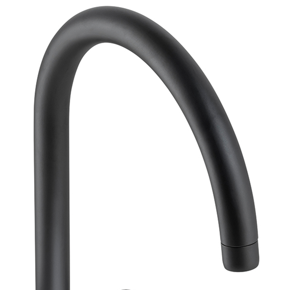 This Globe dual lever kitchen mixer tap effortlessly blends style and functionality. Its slimline body and elegant swan neck spout, finished in a striking matt black, make a sophisticated statement in any kitchen setting – from traditional to contemporary. A perfect fusion of form and performance, this tap is more than just a practical addition, it',s a design feature that elevates your kitchen aesthetic.