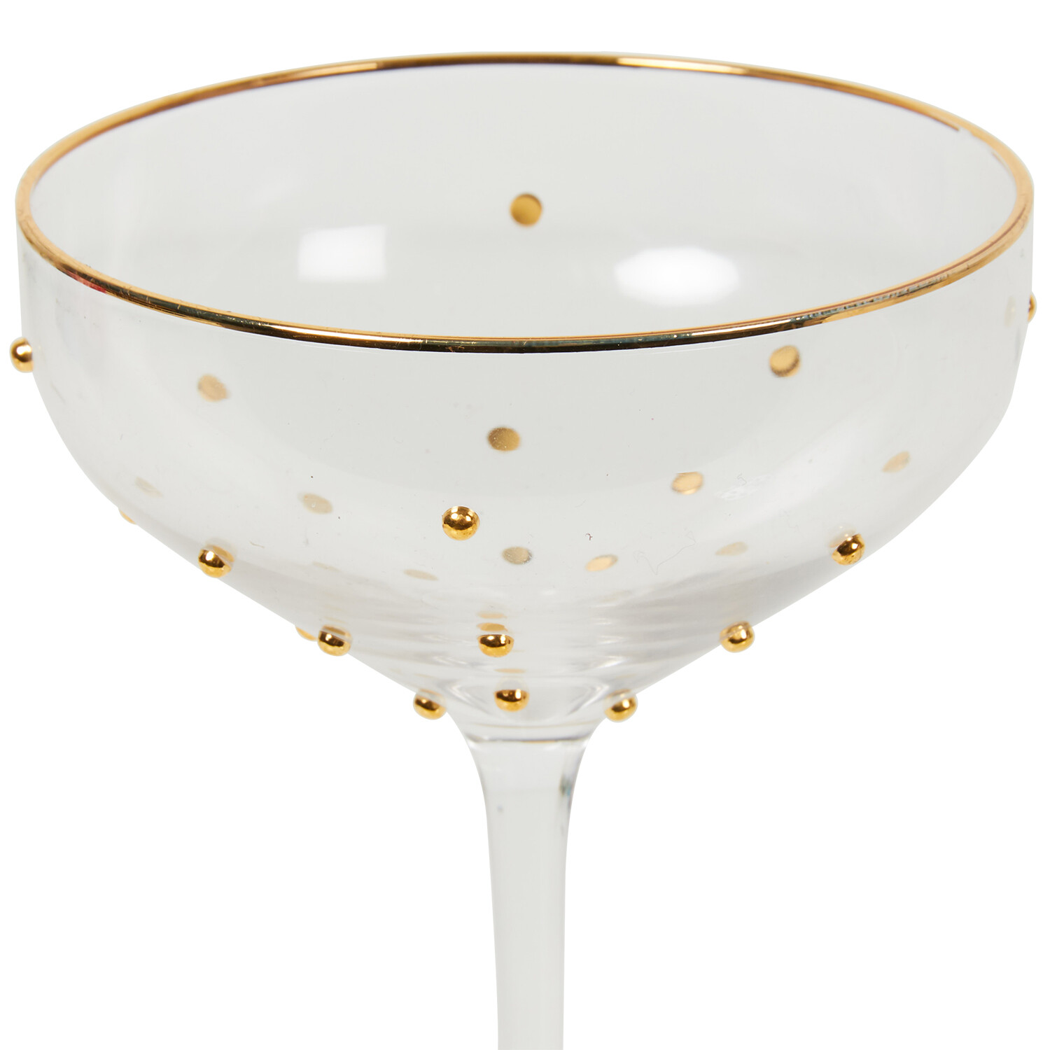 Elevate your dining experience with the 330ml Gold Decor Champagne Coupe. This elegant coupe features a unique polka dot pattern of golden glass beads and painted accents. A gilded rim completes the luxurious look.