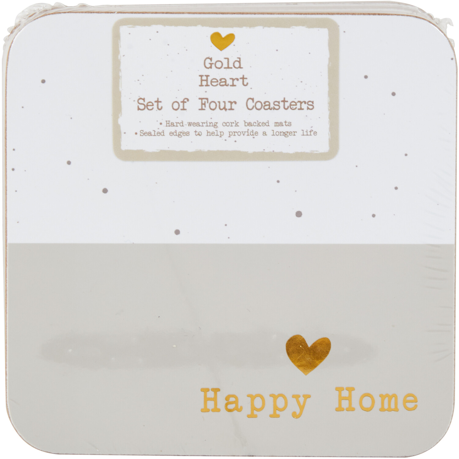 Protect your surfaces in style with this four-piece set of Gold Heart Coasters. Designed to safeguard your furniture from unsightly rings and heat marks caused by both hot and cold drinks, these coasters blend practicality with a touch of charm. Each coaster features a two-tone grey speckled design, elevated by a gold foil heart detail and the words 'Happy Home'. The cork backing ensures a scratch-free experience, while sealed edges enhance durability for long-lasting use. Coordinate your kitchen and dining area with other items from our minimalist Gold Heart collection for a beautifully cohesive aesthetic.