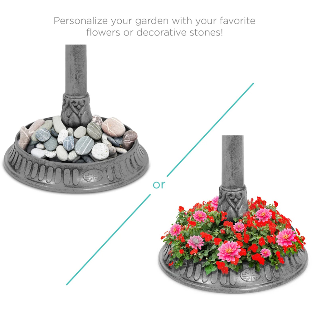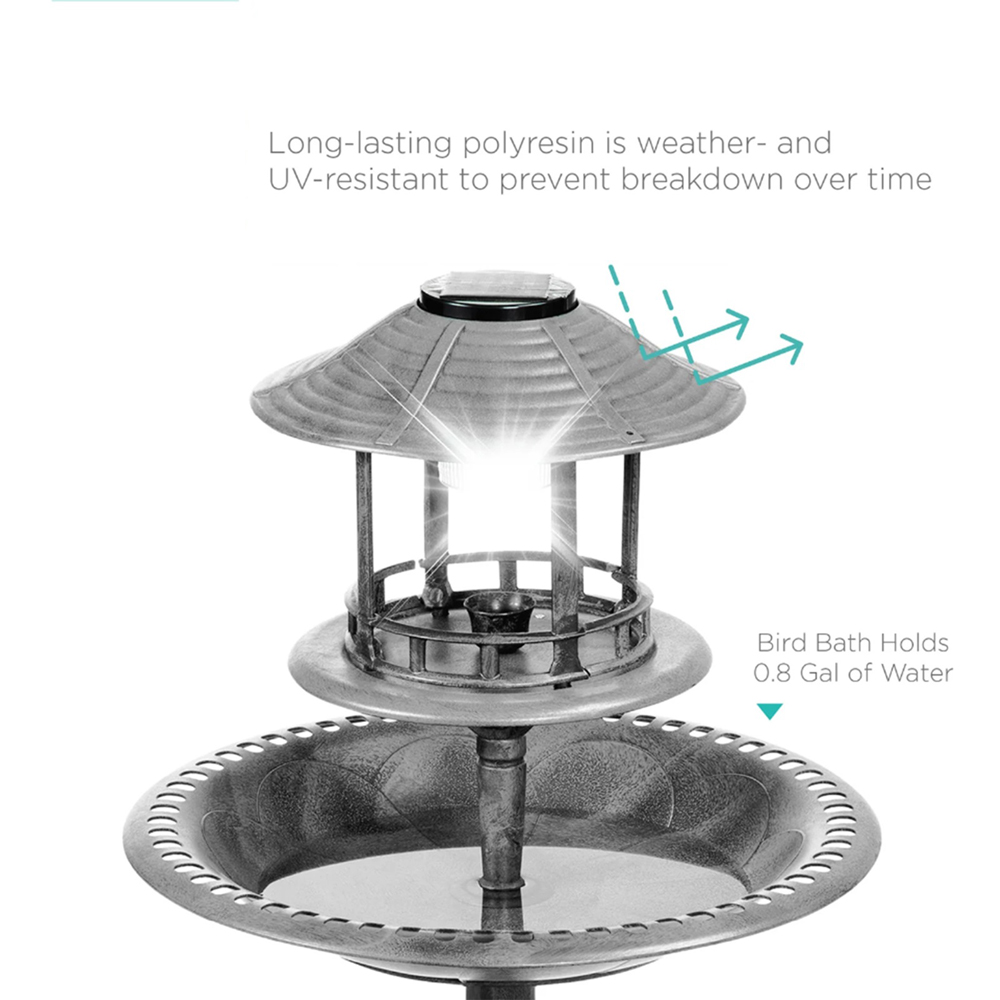 Attract a vibrant array of feathered friends to your garden with this elegant grey plastic bird bath. Standing at a height of 105cm with a 50cm diameter base, this free-standing pedestal design is perfect for patios, decking, or traditional garden settings. Simple to assemble with included instructions, it boasts a durable, weather-resistant resin construction built to last. The generous 0.8-gallon basin conserves water and provides a refreshing spot for birds, while the integrated planter in the wide base offers a charming display space for flowers or decorative stones. A solar-powered lamp, featuring a 1.2V 40mA solar panel and 2 LEDs, illuminates your garden for up to 8 hours nightly (requires one included 1.2V 600mAh Ni-MH rechargeable battery). This detailed, weather-resistant design will enhance your outdoor space and encourage birds to visit throughout the year, aerating soil, distributing nutrients, and helping protect your garden from pests.