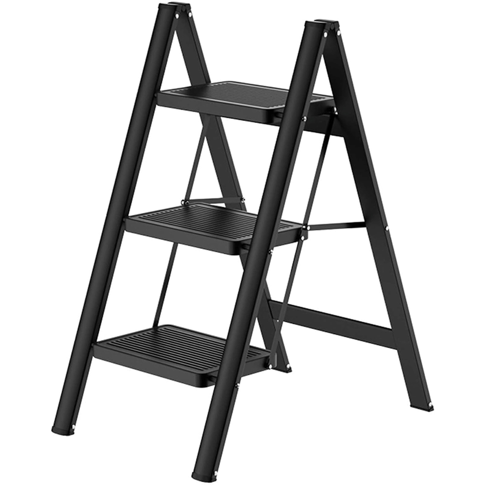 Gr8 Home Black Portable Step Ladder Foldable Stool Non Slip Tread Heavy Duty Metal Carbon Steel Compact Lightweight Folding Home DIY Kitchen Aid. The ladder folds down for easy storage and convenient transportation, making this item the perfect ladder for every kind of DIY job such as decorating, painting and reaching to those hard to get places. Heavy Duty Steel 3 Step Folding Ladder, Size of 3 Step Ladder 42x 63x 84cm, Material: Carton steel, Colour Black, Maximum Load: 120 kg, The step ladder comes with European EN14183 certificate, Slip Resistant Design: Sturdy and wide pedals of kitchen ladder with anti-slip texture. Big rubber feet of step ladder 3 step folding fully touch the ground to stay firmly and prevent floors from scratching.