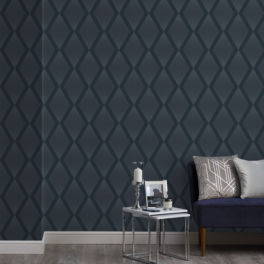 Add a stylish texture to your home decor with this Chandelier wallpaper by Graham and Brown. The navy backdrop coordinates perfectly with the geometric design. The glittering embellishments add a sparkling finish to your walls. Application: Paste the Wall, Design Match: Straight, Design Repeat: 32cm, Roll Length: 10m, Roll Width: 52cm.
