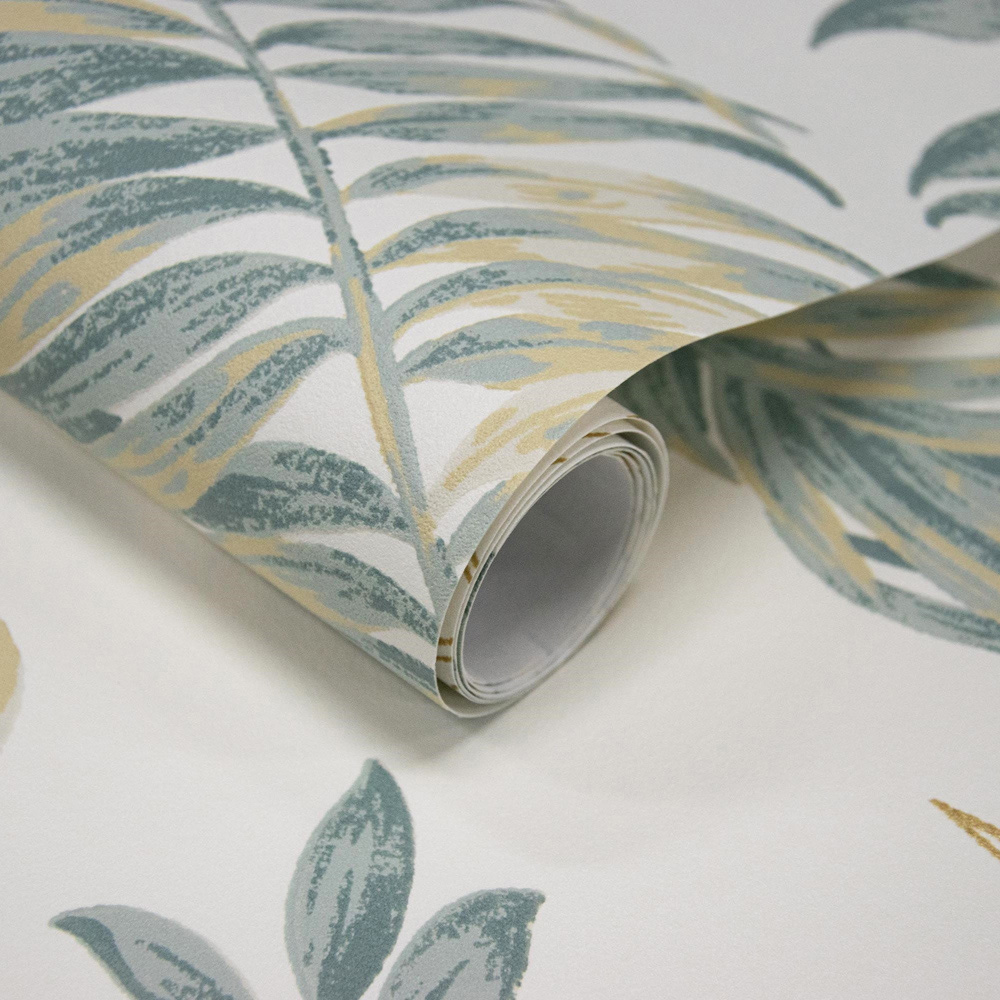 Transform your space with the Grandeco Allison Palm Leaf Foliage wallpaper. This blown vinyl design boasts a plastered texture and a trendy neutral green hue, featuring various plant species in the foreground for an open, airy feel. Gold glitter accents on the leaves add a unique touch, creating a botanical look. Enjoy the convenience of paste-the-wall application—no soaking, no messy paste table required.