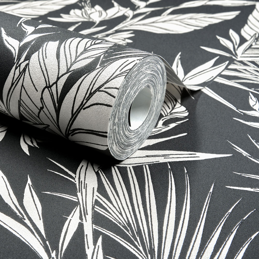Bring the serene beauty of a Japanese garden into your home with the Grandeco Glistening Lucia Tropical Foliage Black Vinyl Wallpaper. This exquisite Omura collection design showcases elegantly shaped leaves set against a pearly off-white backdrop, creating a striking contrast. Shimmering mica details add a touch of subtle glamour. The paste-the-wall application simplifies installation, just apply paste directly to the wall. With a 10.05m length, 53cm width, 64cm pattern repeat, and straight match, this wallpaper (Pattern Number: A71103) is perfect for adding a touch of sophisticated style to any room.