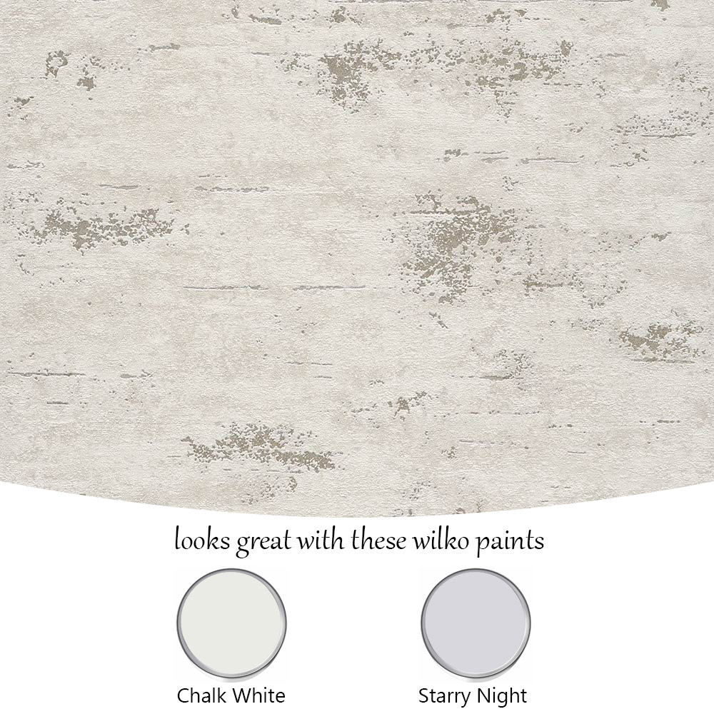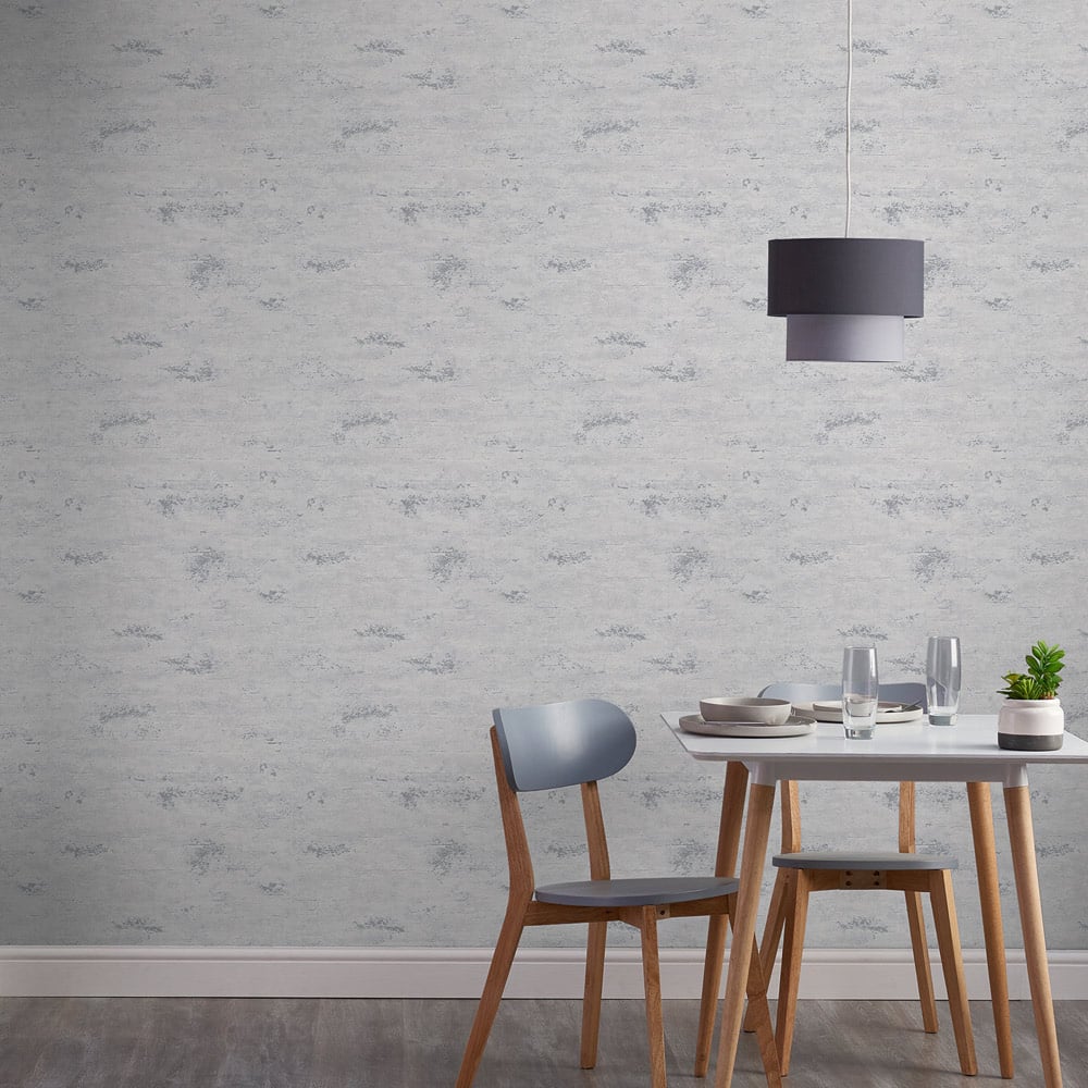 Escape to the lunar landscape with Grandeco',s On The Rocks wallpaper. This stunning white and silver design boasts a distressed concrete and stone texture, finished with metallic accents for a refined industrial feel. Inspired by the abstract beauty of space, this blown vinyl wallpaper is incredibly easy to hang using the paste-the-wall method. Plus, it cleverly conceals minor wall imperfections.