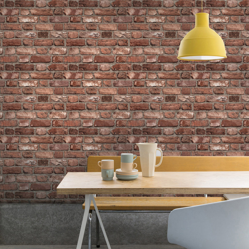 Transform your home with Grandeco Vintage Brick Wall Textured Red Terracotta Wallpaper. This photographic brick design offers a contemporary loft aesthetic, bringing a modern edge to any room. The realistic design and deep colours create a striking feature wall. Crafted from durable vinyl, this wallpaper is suitable for all rooms, particularly enhancing kitchens and dining areas. The rich terracotta shade adds warmth and character, effortlessly achieving the look of exposed brickwork without the effort.
