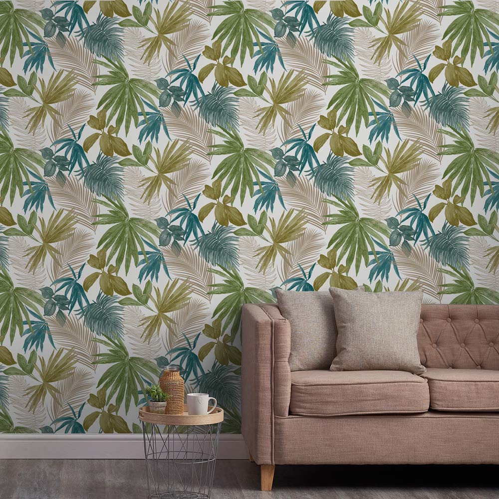 Transform your space with the Green Teal and Copper Wild Palm Metallic Textured Wallpaper. This vibrant design showcases lush green leaves with gold accents, bringing a fresh, jungle-inspired feel to any room. The metallic embossed finish adds depth and texture, creating a truly captivating look. Easy to hang using paste-the-wall application, it also cleverly conceals minor wall imperfections.
