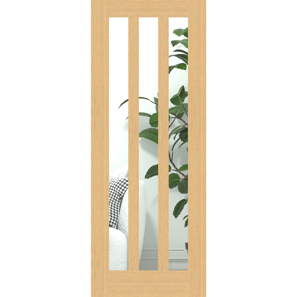 Enhance your home with the classic charm of the Green & Taylor Aston Oak Clear Glazed Internal Door 1981 x 838 x 35mm. This internal door offers a sophisticated and cost-effective solution for adding style to your living space. It is designed to improve light flow between rooms, broadening your options for interior design. Meticulously crafted, these doors come unfinished, allowing you to add your personal touch to their final appearance. Each door features bold, shaker-style panels made of 4mm toughened glass, providing a striking and contemporary look. Standard features include solid oak 8mm lippings, ensuring ease and flexibility in fitting and adjustments, making these doors a practical choice for various home environments. The door is designed for customisation to match your preferred finish, enhancing its versatility. It is fitted with high-quality toughened glass arranged in three vertical panels, which adds an air of elegance and modernity to its overall design. Constructed from engineered oak with a solid core, it includes a simple, unobtrusive veneer that seamlessly integrates with the glass panels. Ideal for areas such as living rooms or kitchens, where the focus is on light rather than privacy. They can effortlessly adapt to a wide range of interior styles, bringing a natural, welcoming presence to any contemporary home. Dimensions: 1981 x 838 x 35mm.