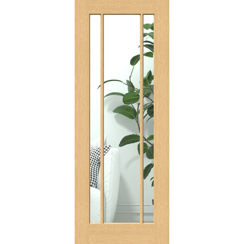 Transform your space with the Green & Taylor Worcester Oak 3 Lite Clear Glazed Internal Door 1981 x 813 x 35mm. This internal door combines strength, elegance, and versatility, making it suitable for both modern and classic interiors. It perfectly balances the charm of traditional styles with the clean lines of contemporary design. Delivered unfinished, this door offers the flexibility for on-site personalisation, ensuring it matches your interior décor perfectly. At its core, the door features a robust solid design made from quality oak. It includes a large central pane of clear, toughened glass, elegantly segmented and accentuated by two sleek vertical astragal bars. This design enhances its aesthetic appeal and also serves a practical purpose by allowing natural light to flow seamlessly between rooms, brightening your living spaces. The door comes with ample oak lippings for easy adjustments, making it suitable for slightly irregular openings. This door is an ideal choice for residential and commercial settings, particularly in areas that require enhanced fire safety measures. Note: Doors with a width of 24" (610mm) or less feature a simpler two-pane design, with a single bead, differing from the standard three-pane configuration. This variation ensures that even smaller spaces can enjoy the elegant design and practical benefits of the Worcester Oak 3 Lite Clear Glazed Internal Door. Dimensions: 1981 x 813 x 35mm.