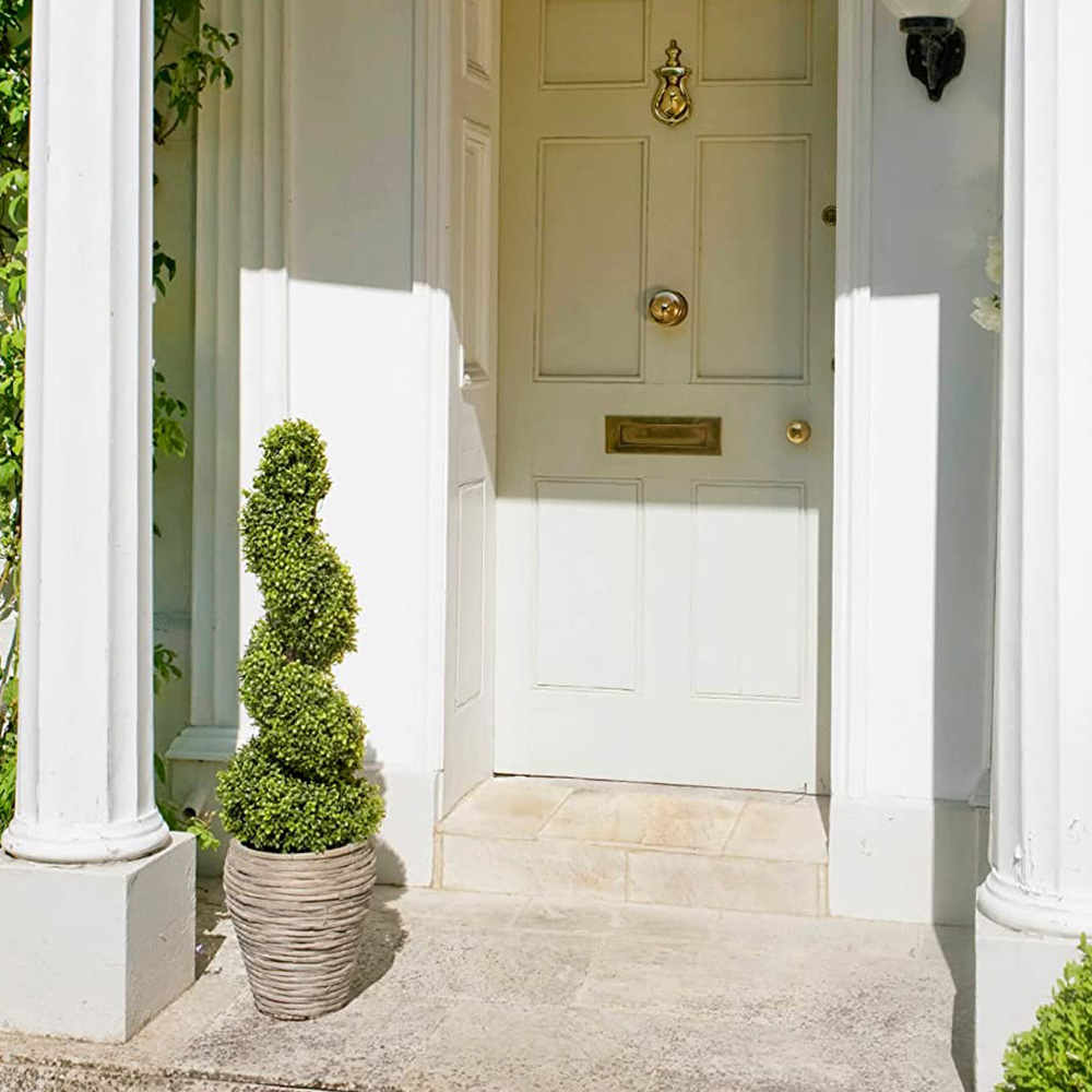 Bring the beauty of nature indoors and out with these lifelike artificial boxwood spiral trees. Their classic shape and realistic appearance make them nearly indistinguishable from real plants, requiring zero maintenance and looking perfect year-round. The UV-protected foliage resists fading, even in direct sunlight, making them ideal for both indoor and outdoor use. These versatile trees add instant elegance to any setting, from entrances and balconies to offices and restaurants. For a more finished look, place them in large planters (sold separately), weighing the base with sand or stones and filling with soil to conceal the pot. Each tree boasts a sturdy solid wood centre for lasting durability. Includes two 90cm tall trees.
