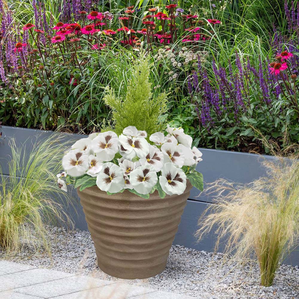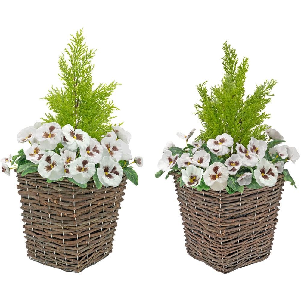 Add a touch of vibrant colour and effortless style to your outdoor space with this pair of dark rattan planters. Featuring lifelike artificial pansies and a central conifer or cedar topiary, these planters offer the beauty of blooms without the upkeep. Their realistic appearance makes them virtually indistinguishable from real plants from a short distance. Perfectly sized at H60 x W30cm, these pre-assembled planters are ready to instantly enhance your porch, patio, or garden. Designed for both indoor and outdoor use, they boast UV protection to prevent colour fading, ensuring they remain vibrant all year round. While suitable for all weather, we recommend sheltering them from extremely windy conditions. Enjoy the low-maintenance charm of these artificial planters – no watering, feeding, or pruning required! Ideal for adding a touch of greenery to homes, businesses (shops, bars, restaurants, hotels), or educational settings (offices, schools, nurseries), these planters offer a simple yet sophisticated solution for any environment. A pack of two.