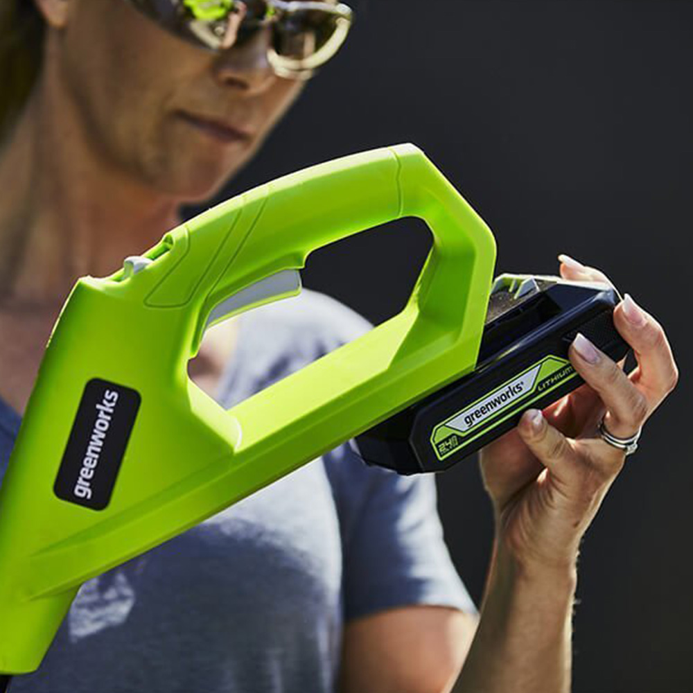 This Greenworks 24V 2Ah Battery and Charger Kit will keep your gardening tools running strong. Included is a 24V 2Ah lithium-ion battery, providing increased power, longer runtimes, higher speeds, and quieter operation compared to other batteries. The universal charger features integrated cooling and a charge status indicator LED. The battery is covered by a 2-year warranty, and the charger has a 3-year warranty.