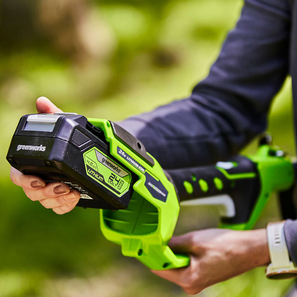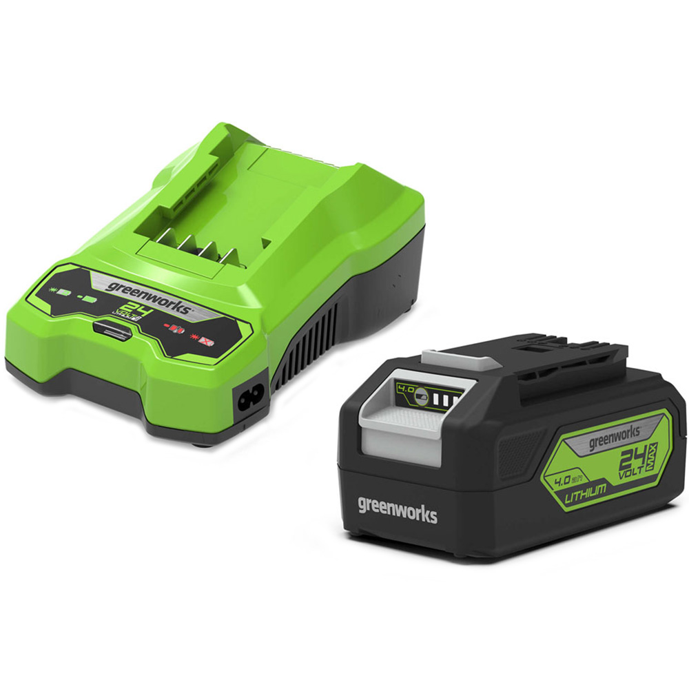 This Greenworks 24V 4Ah Battery and Charger Kit will keep your gardening tools running strong. The kit provides a powerful 24V 4Ah lithium-ion battery and a universal charger. Enjoy increased power, longer runtimes, higher speeds, and quieter operation with improved efficiency. The intelligent charger includes integrated cooling and a convenient LED charge indicator to monitor charging progress. The battery is backed by a 2-year warranty, while the charger is covered by a 3-year warranty.