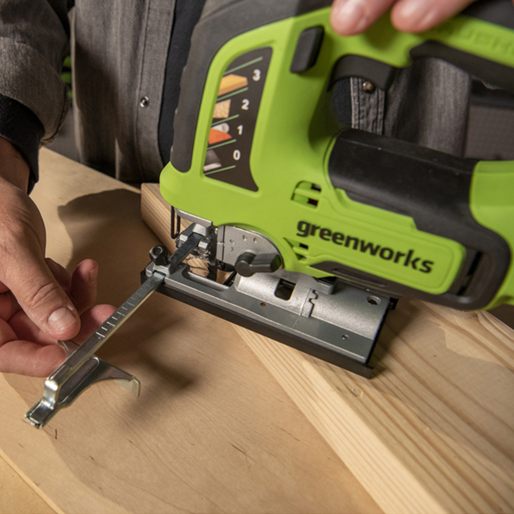 Achieve precision and flexibility in your cutting tasks with the Greenworks 24V Brushless Jigsaw. The brushless motor ensures efficient performance and a longer tool lifespan. Adjust the cutting speed with the variable speed control to suit different materials, ensuring clean, accurate results. The tool-free blade change system allows for swift and simple blade replacements, boosting productivity. Its ergonomic, lightweight design reduces fatigue, making it comfortable to use for extended periods. An integrated LED light illuminates the cutting area, improving visibility and precision. This cordless jigsaw offers the freedom to work without being tethered to a power outlet and is compatible with all Greenworks 24V batteries. Please note, this is sold as a bare unit.