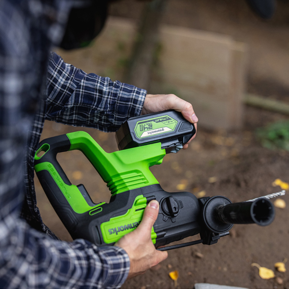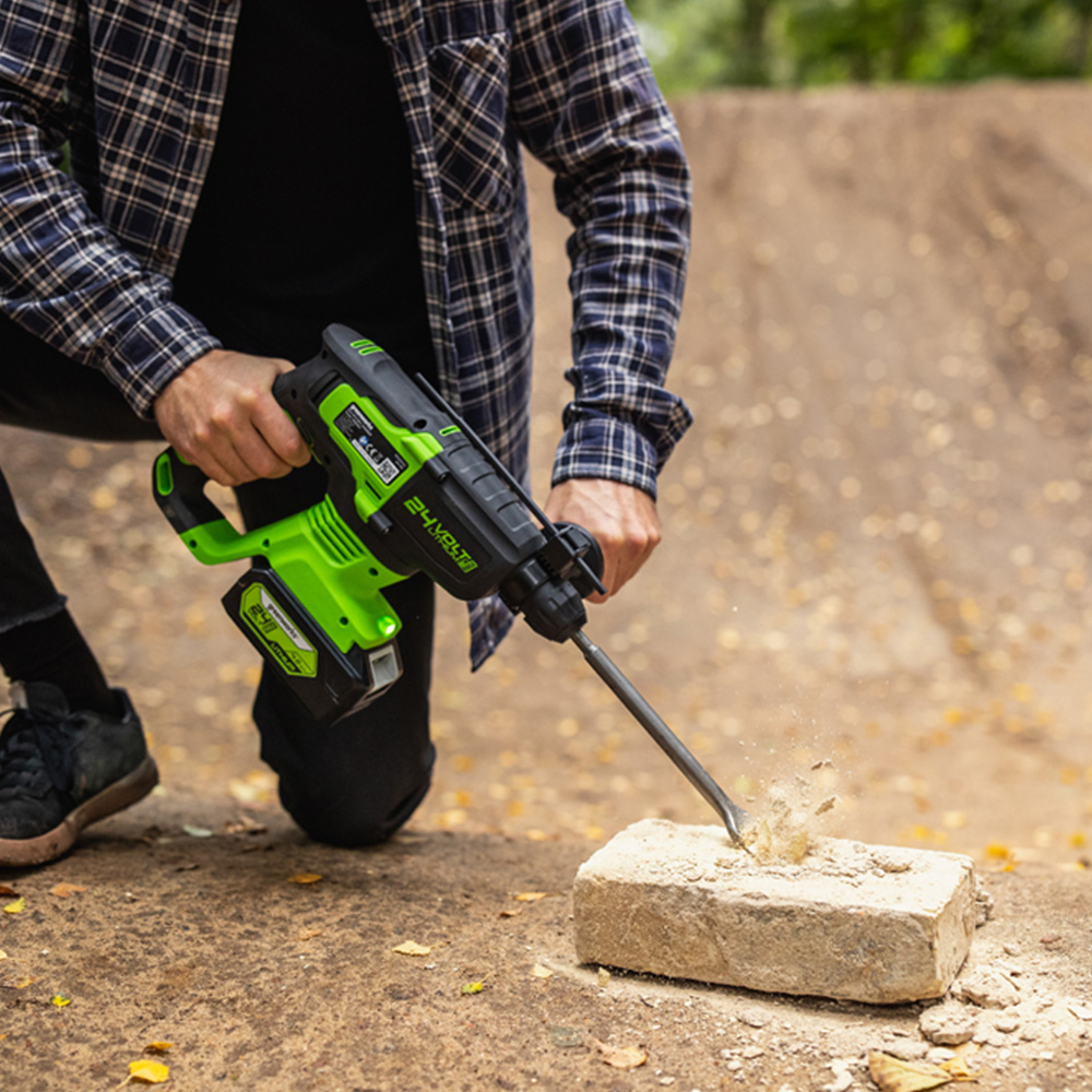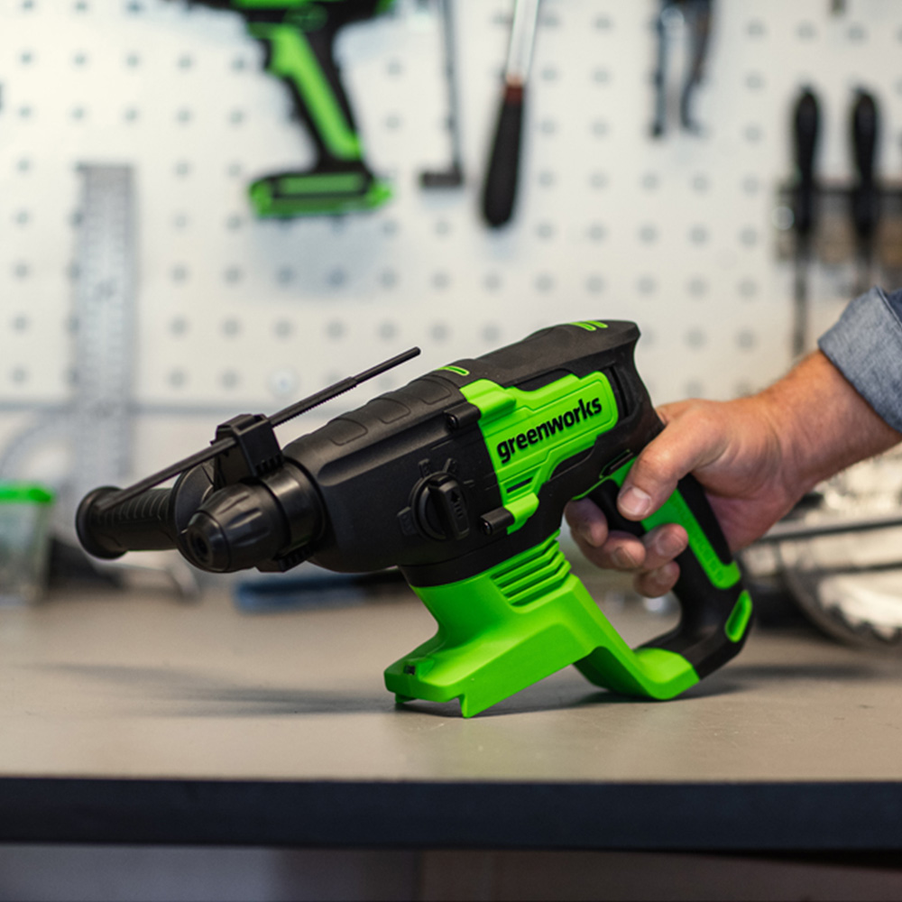 Users can adjust the drilling speed to match the task at hand, with a variable speed of up to 1,000 RPM. The quick-release SDS chuck enables fast and simple bit changes, while the integrated LED light improves visibility in dimly lit workspaces. Weighing just 2.47 kg, its compact design ensures comfortable handling and reduces user fatigue during prolonged use. Part of the Greenworks 24V family, this cordless tool offers convenience and is compatible with all Greenworks 24V batteries. Sold as a bare unit.
