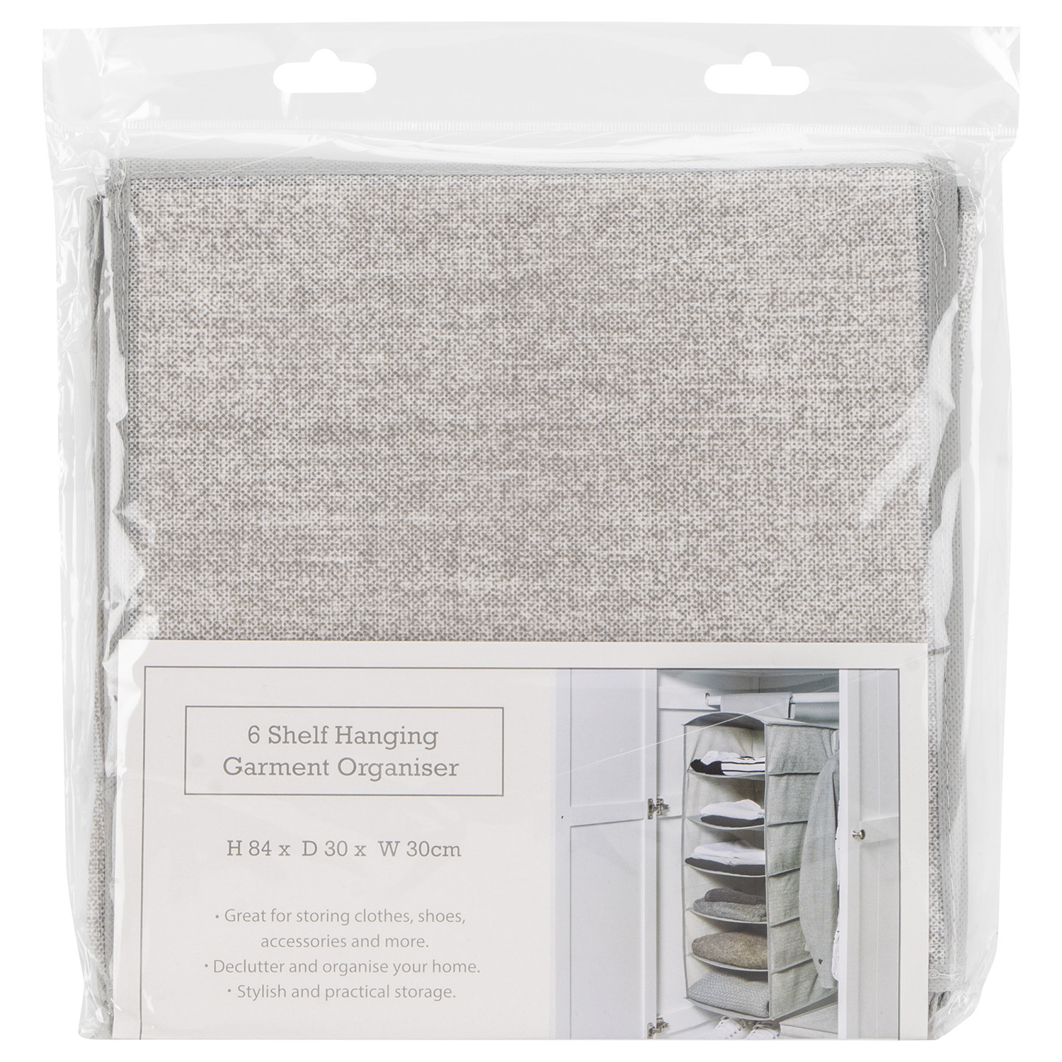 Maximise your wardrobe space with this six-shelf hanging garment organiser. Designed for easy installation, this clever storage solution features six compartments perfect for clothes and accessories. Simply attach it to your hanging rail using the hook and loop fastening for quick and neat organisation of your garments and belongings.