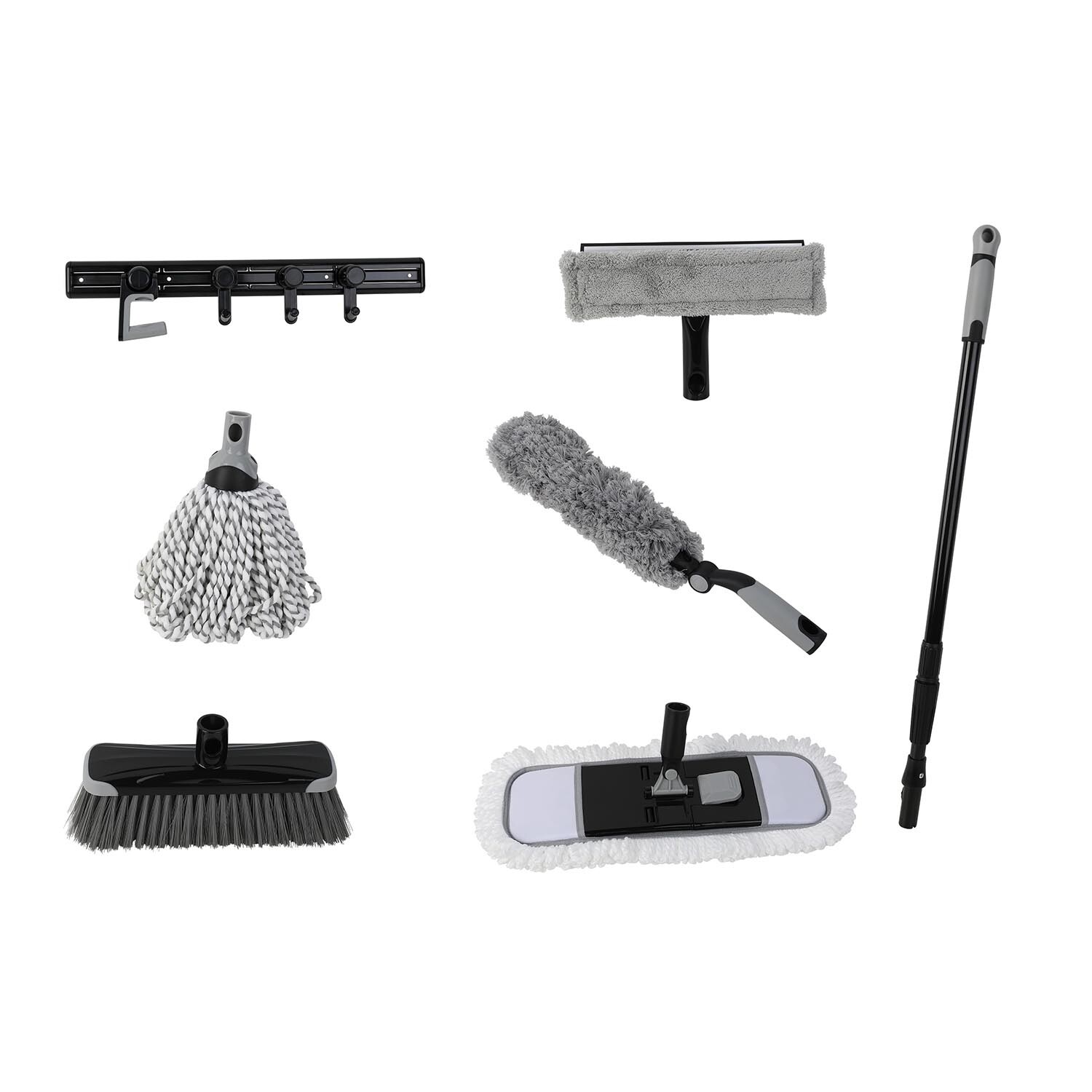 This versatile 7-piece cleaning set makes light work of all your household chores. The kit comprises a single handle, along with interchangeable broom head, duster head, squeegee head, and flat mop head. A storage hook is also included. Ideal for smaller homes, the detachable heads can be neatly organised on the provided hook when not in use.