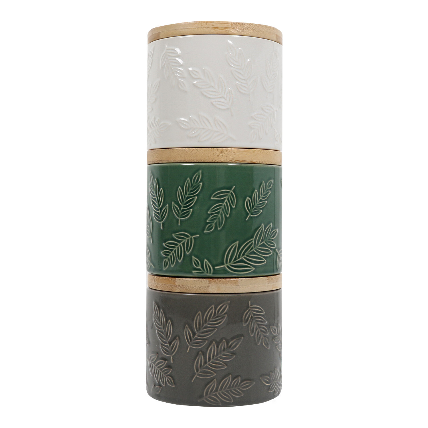 Elevate your kitchen's style and organisation with this Botanical Ceramic Stacking Canister. Its subtly embossed leaf design adds a touch of understated elegance, while the three available colours – white, grey, and green – ensure a perfect match for your existing décor. Each canister features a convenient bamboo lid, allowing for neat stacking and effortless storage. The airtight silicone seal maintains freshness, making them ideal for tea, coffee, sugar, flour, rice, and a host of other dry goods.