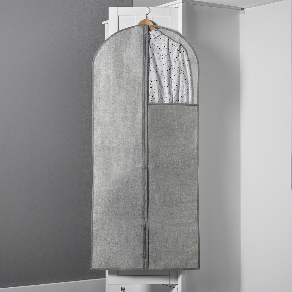 Effortlessly organise and protect your clothing with this grey dress carrier with window. Designed for hanging garments such as dresses, jackets, and suits, this neat storage bag keeps your clothing safe when not in use. A convenient window allows you to identify the garment without opening the bag.