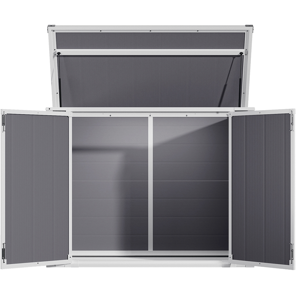 Keep your garden tools and equipment neatly organised with this 4.6ft x 2.3ft Garden Storage Shed. This durable shed, crafted from high-quality plastic and aluminium alloy, offers robust protection against the elements and resists both deformation and corrosion. The design features two convenient doors and a hinged top, providing easy access for even larger items such as bicycles or refuse bins. Corner protectors enhance its strength and a secure door latch helps keep out unwanted visitors. Simple to assemble, this practical shed is a stylish addition to any outdoor space. Internal dimensions: H109.7cm x W142.1cm x D74.8cm. Door Size: H104.5cm x W110cm.