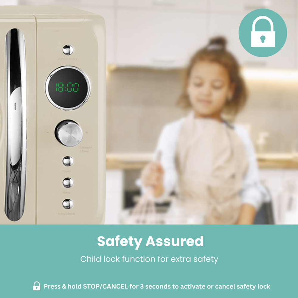 Upgrade your kitchen with the Hamilton Beach Cream Microwave – a stylish and practical appliance perfect for everyday use. Its compact 20L size makes it ideal for smaller kitchens, adding a touch of retro charm without compromising on performance. Boasting a powerful 700W output and energy-efficient technology, it’s a great choice for those who want both speed and sustainability. Eight convenient cooking presets offer flexibility, whether you’re reheating leftovers or defrosting frozen meals. Precise controls and a quick start function ensure effortless operation, while the glass turntable guarantees even cooking. The clear digital LED display keeps you informed, and a handy child lock adds an extra layer of safety. This microwave is a reliable and affordable kitchen companion, making mealtimes easier for the whole family. This item is delivered direct to you from one of our suppliers, please see our Terms and Conditions for more details.