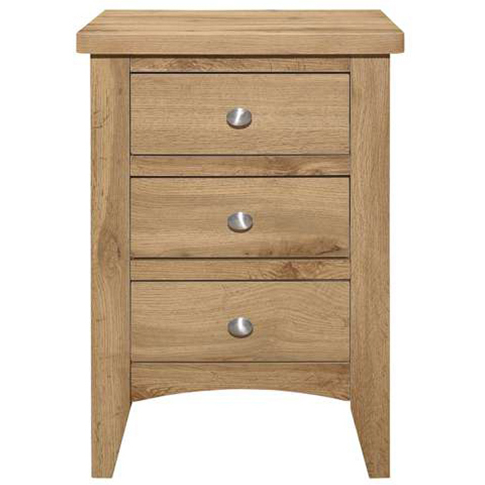 The Hampstead Bedside Table is a timeless design complementing both traditional and contemporary styles. Its rustic charm showcases the natural wood grain. Crafted from particleboard with a paper-laminated wood finish, it offers both style and durability. Three spacious drawers provide ample storage for bedside essentials, making it ideal for a bedside lamp and perfect for any bedroom. Simply wipe clean with a soft, dry cloth for easy maintenance.