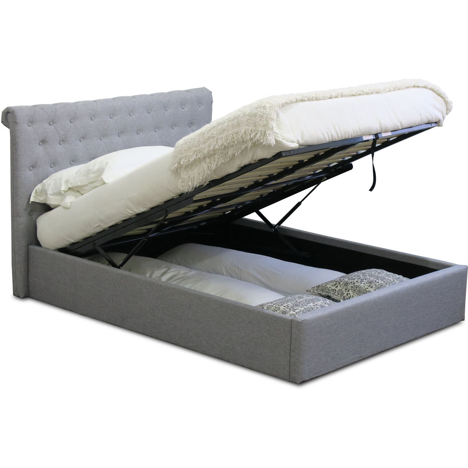 The Harper ottoman bed: understated elegance for the modern bedroom. Its grey fabric upholstery, covering both headboard and base, complements any décor scheme. Clever ottoman storage, easily accessed, provides ample space for bedding or seasonal clothing, keeping your bedroom clutter-free. Constructed from durable yet affordable materials, this bed offers high-end style without the high-end price tag. Simple assembly ensures you'll enjoy a restful night's sleep from the moment it's in place.