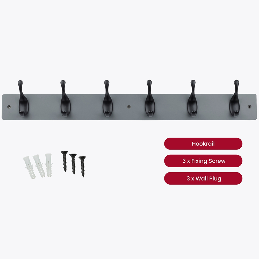 • Features 6 matte black coat hooks on grey wooden board