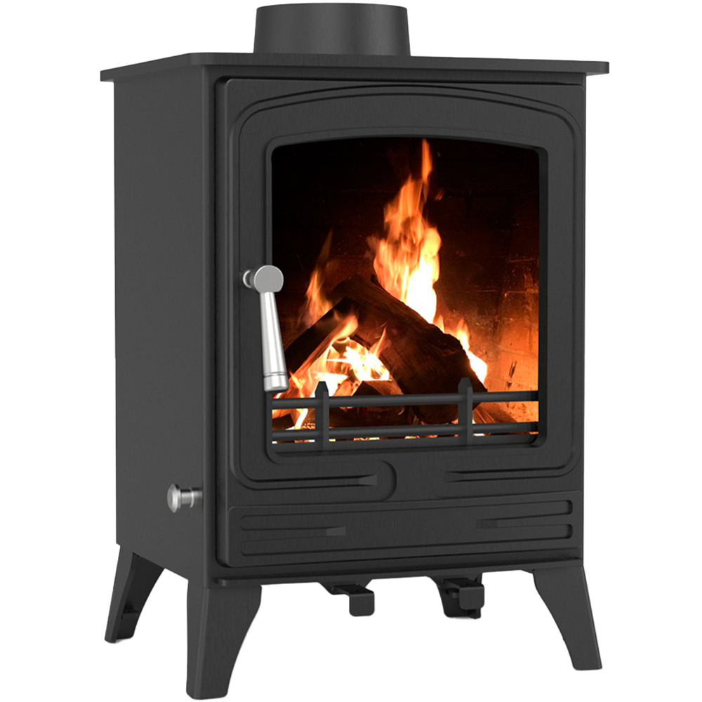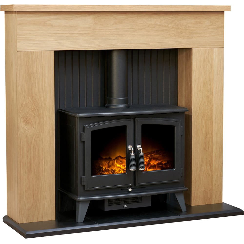 Adam Black Woodhouse Stove with Oak Beam and Hearth Stove Pipe