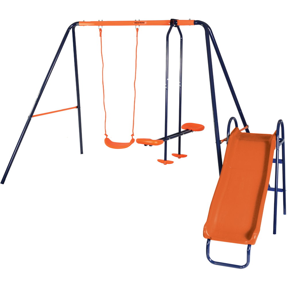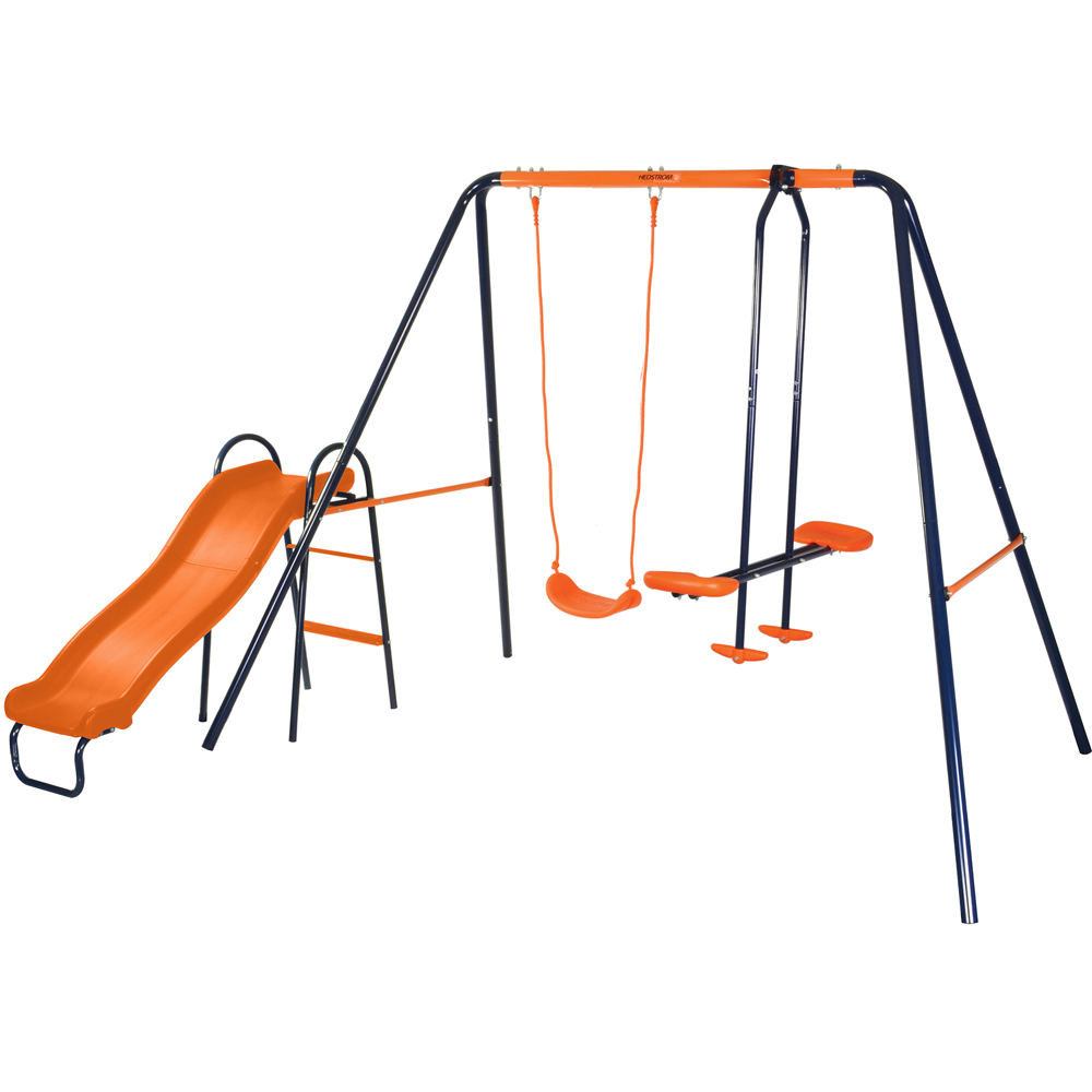The Hedstrom Saturn Junior Swing and Slide Set delivers endless fun for kids! This versatile playset features a swing with a comfortable blow-moulded seat and soft-touch ropes, a glider with blow-moulded seats and footrests for a smooth ride, and a 4ft wavy slide made from blow-moulded material and steel for durability. Up to four children can play at once. Safety is key, with handrails, a front support bar, and textured steps for easy access. The heavy-duty powder-coated steel frame ensures long-lasting durability, and the entire set is UV resistant. Dimensions: H180 x W285 x L195cm. For safe use, always secure the set to the ground with the included anchors, we recommend concreting for added stability.