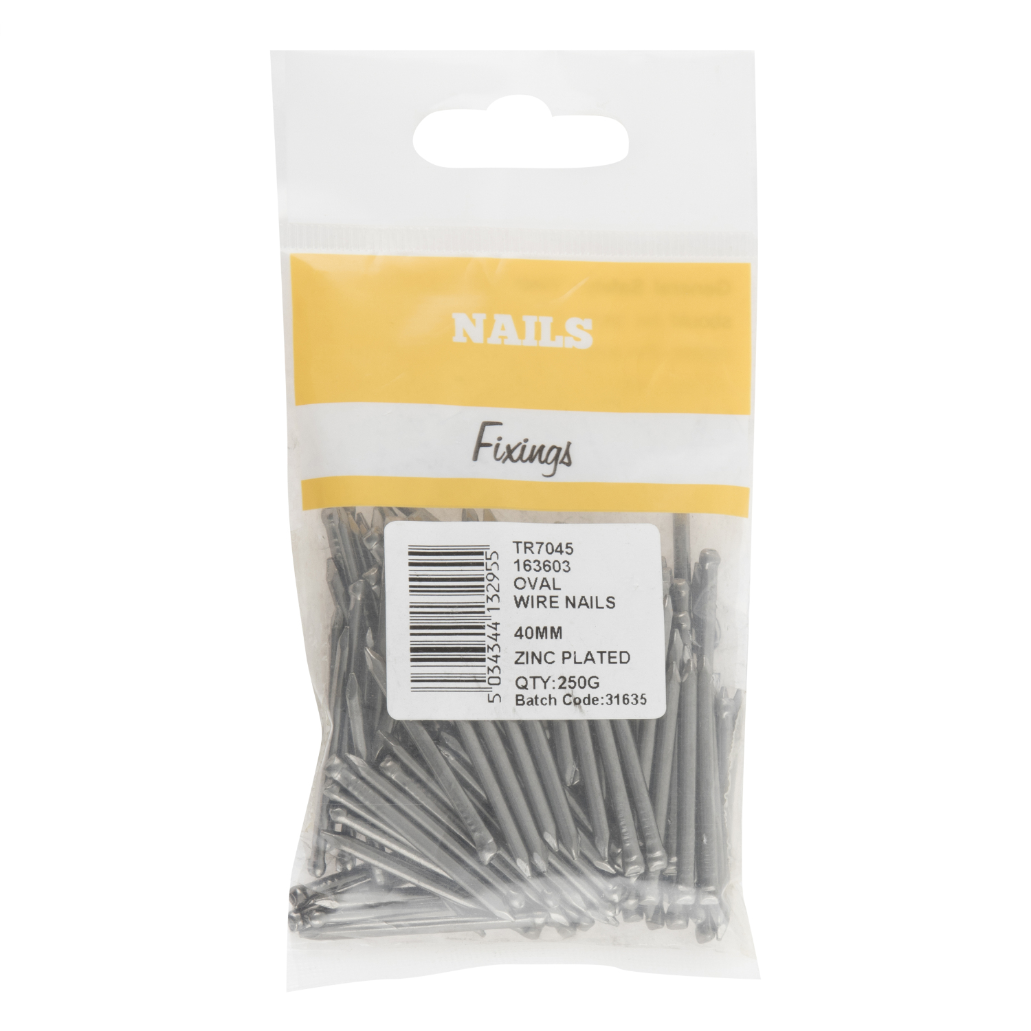 This pack of oval wire nails is perfect for carpentry projects. Designed for use in softwoods, their shape minimises splitting. The zinc plating provides excellent corrosion resistance, ensuring a long-lasting finish. These nails are easily countersunk for a neat, seamless join.
