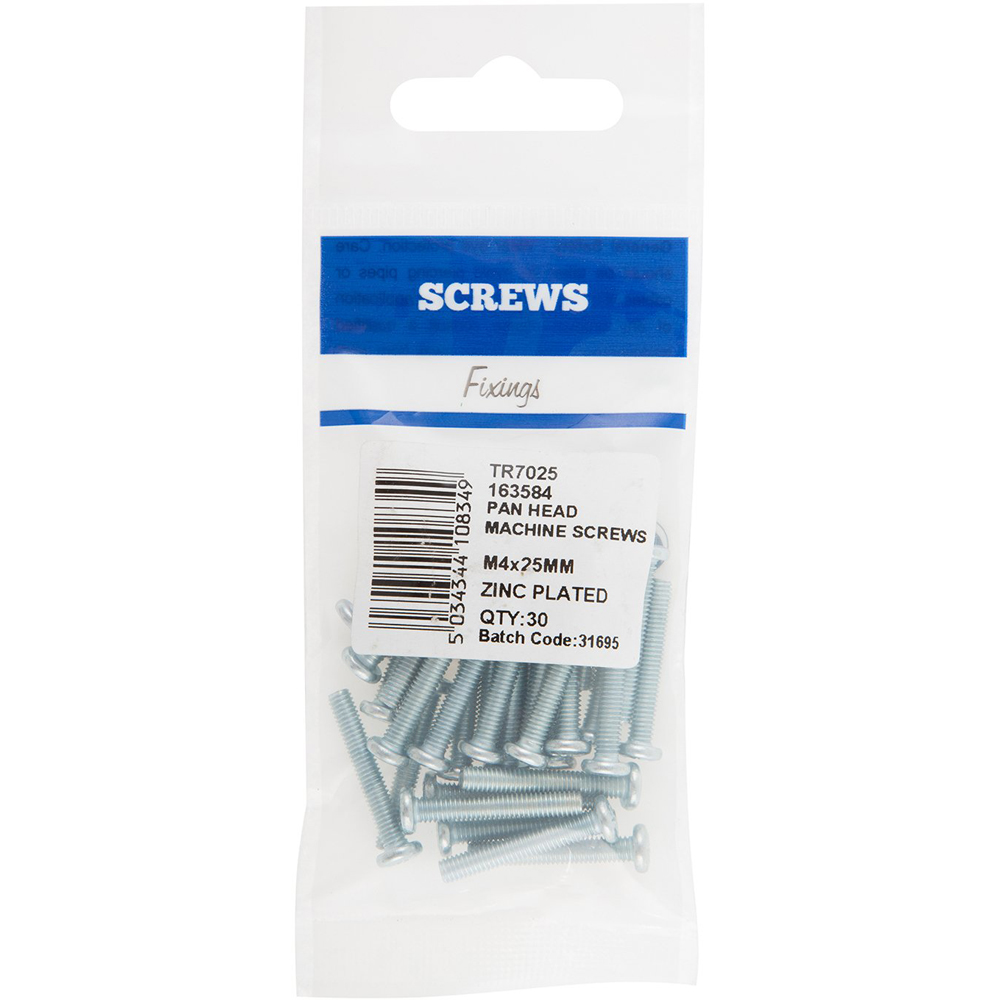 For dependable fastening in diverse projects, choose Hiatt M4 x 25mm Pan Head Machine Screws. This pack of 30 zinc-plated screws offers lasting corrosion resistance, making them ideal for securing sheet metal, metal fencing and other metal structures around your home, garage, or garden. The pan head design ensures easy fitting and a neat, flush finish. Available in a range of sizes.