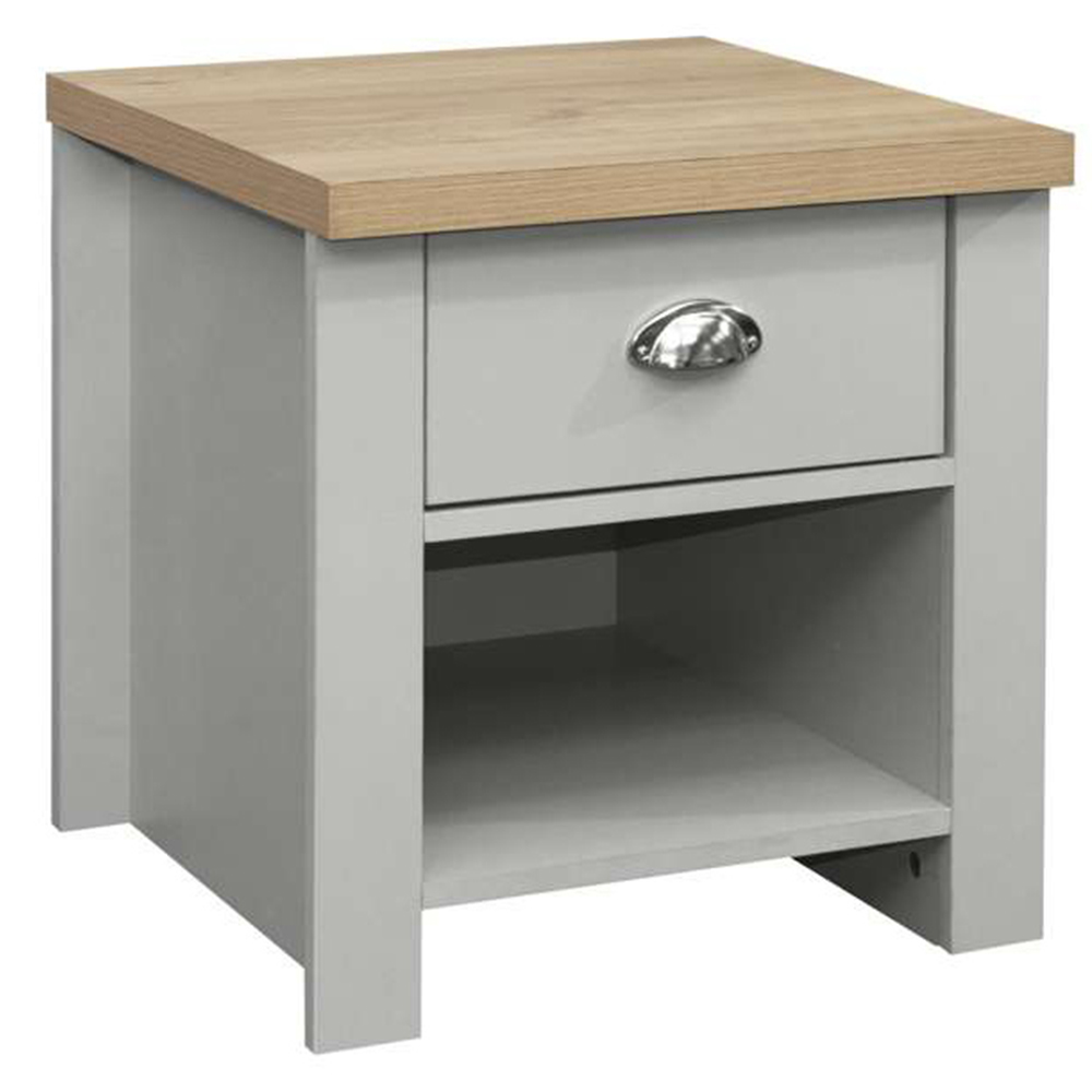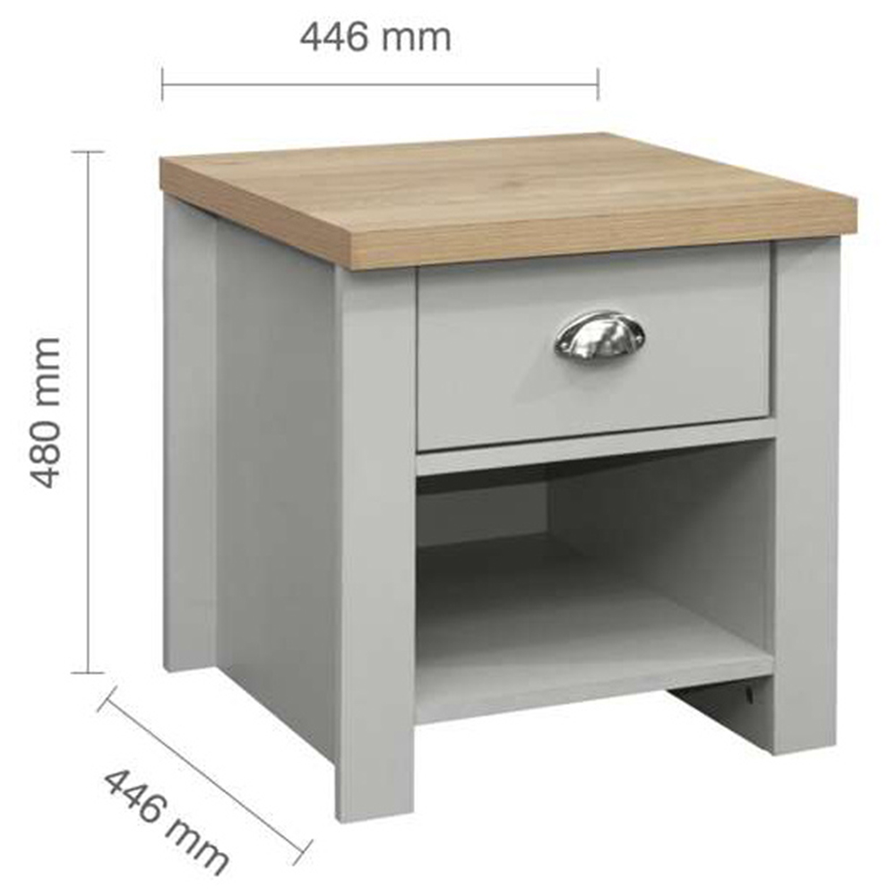 This charming Highgate single drawer lamp table brings timeless farmhouse style to your home. Its grey and oak finish complements both modern and traditional interiors. The compact design features a smooth top surface, a single drawer with a satin-silver handle for convenient storage, and a lower open shelf perfect for books. Internal dimensions measure 212 x 319mm. Simply wipe clean with a soft, dry cloth.