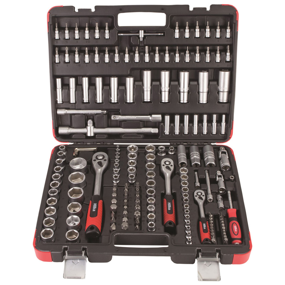 This extensive socket and bit set conquers virtually any fastening task. The durable satin chrome finish on the fully heat-treated chrome vanadium steel sockets provides superior torque and protects nuts. A smooth-action 72-tooth quick-release ratchet, featuring a spring-loaded ball bearing, ensures secure engagement. The set boasts an impressive array of components: 13pc 1/4", drive sockets (4, 4.5, 5, 5.5, 6, 7, 8, 9, 10, 11, 12, 13, 14mm), 7pc 1/4", drive deep wall sockets (4, 5, 6, 7, 8, 9, 10mm), 5pc 1/4", drive E-sockets (E4, E5, E6, E7, E8), 2pc 1/4", drive extension bars (2", &, 4",), a 1/4", drive sliding T-bar, universal joint, coupler, spinner handle, and quick-release ratchet handle. The 30pc 1/4", drive bit sockets include: Slotted (4, 5.5, 7mm), Philips (PH1, PH2, PH3), Pozi (PZ1, PZ2, PZ3), Hex (2, 3, 4, 5, 6mm), Tx Star (T8, T9, T10, T15, T20, T25, T27, T30), and Tx Star tamper-proof (TH8, TH9, TH10, TH15, TH20, TH25, TH27, TH30). Also included are: 10pc 3/8", drive sockets (10, 11, 12, 13, 14, 15, 16, 17, 18, 19mm), 6pc 3/8", drive sockets (10, 11, 12, 13, 14, 15mm), 5pc 3/8", drive E-sockets (E10, E11, E12, E14, E16, E18), a 5", 3/8", drive extension bar, an 8mm 3/8", drive coupler, an 18mm 3/8", drive spark plug socket, and a 3/8", drive quick-release ratchet handle. The 1/2", drive selection comprises: 18pc sockets (10, 11, 12, 13, 14, 15, 16, 17, 18, 19, 20, 21, 22, 23, 24, 27, 30, 32mm), 5pc deep sockets (16, 17, 18, 19, 22mm), 3pc E-sockets (E20, E24), 2pc extension bars (5", &, 10", with three-way adapter), a universal joint, coupler, 2pc spark plug sockets (16mm &, 21mm), and a quick-release ratchet handle. Rounding out this extensive set are: a hex key set (1, 1.5, 2, 2.5, 3, 4, 5mm), 20pc 25mm bits (Tx Star: T5, T6, T7, Tx Star tamper-proof: T7, T10, T15, T20, T25, T27, T30, T40, T45, Ribe: M5, M6, M7, M8, M9, Spline: M5, M6, M8), and 30pc 30mm bits (Slotted: 8, 10, 12mm, Philips: PH3, PH4, Pozi: PZ3, PZ4, Tx Star: T40, T45, T50, T55, T60, T70, Tx Star tamper-proof: T40, T45, T50, T55, T60, T70, Hex: 7, 8, 10, 12, 14mm). All housed in a convenient blow-moulded case.