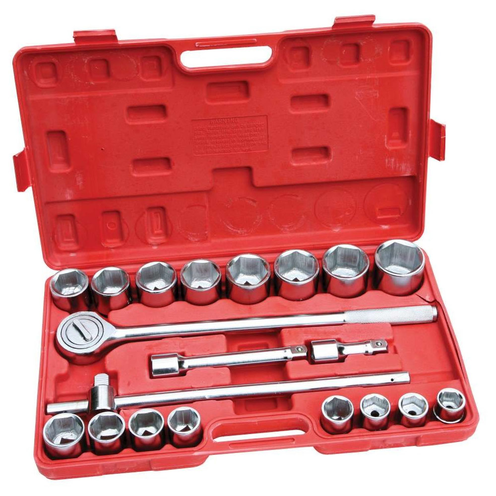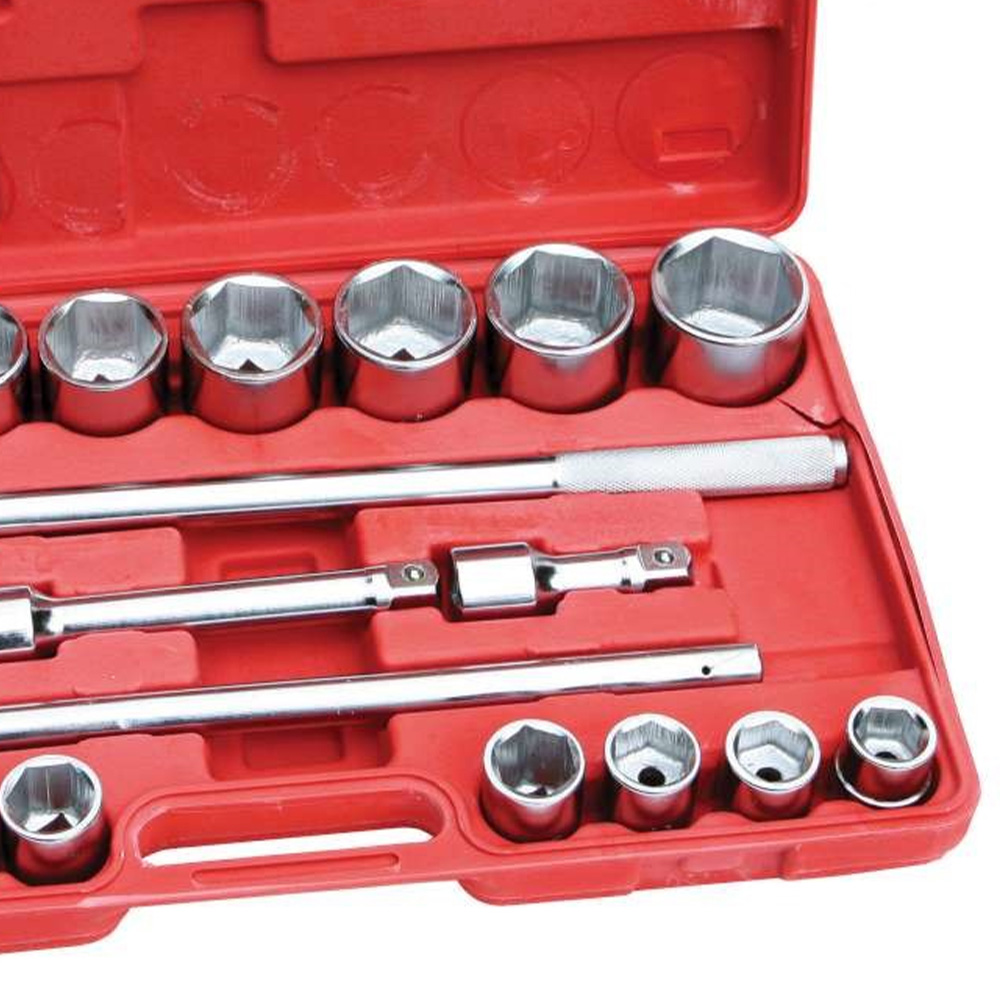 This Hilka socket set is a must-have for any serious mechanic. The polished 3/4", drive set includes sixteen metric sockets ranging from 22mm to 50mm (22, 24, 26, 27, 28, 30, 32, 36, 38, 41, 42, 45, 46, 48, 50mm). Also included is a reversible ratchet, a sliding T-bar, and two extensions, all neatly stored in a blow-moulded case with a coloured sleeve.