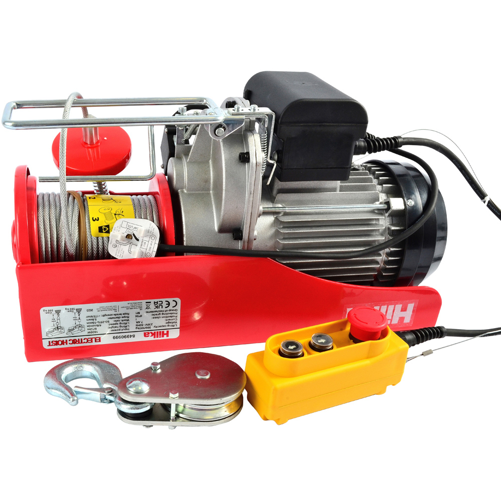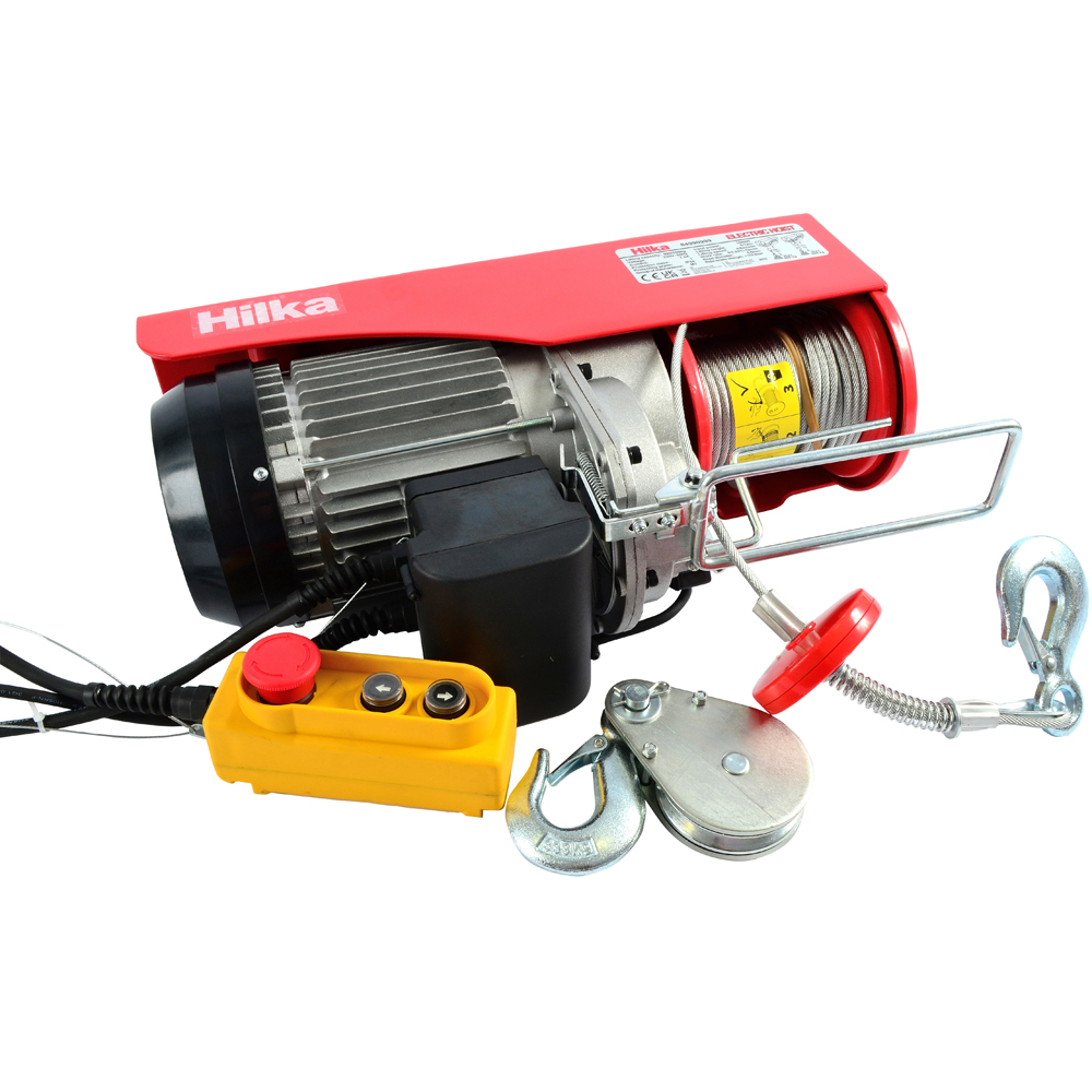 Power through heavy lifting with the Hilka Electric Hoist, boasting a robust 230V, 1600W motor for impressive performance. Lift up to 999kg at 6 metres using the pulley, or 500kg at 12 metres without. Ideal for demanding jobs on construction sites, in workshops, on farms, or in garages. Safety features include a remote control with emergency stop, upper and lower limit devices to prevent overloading, anti-reverse winding, and thermal overload protection to safeguard the motor. Quick and easy installation is ensured with included support brackets. Its IP54 rating protects against dust and water splashes (but keep it out of the rain.