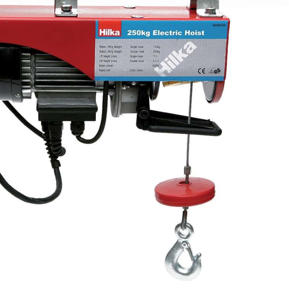 This robust electric hoist tackles lifting jobs around the home, barn, workshop, or building site. It includes a pulley, support brackets, and a remote control for effortless operation. Safety is paramount, with an emergency stop button conveniently located on the control switch. Boasting an IP54 rating, it',s suitable for outdoor use (excluding direct rainfall). The hoist',s lifting capacity is 125kg without the pulley and 250kg when using the pulley, lifting height is 10m without and 5m with the pulley.