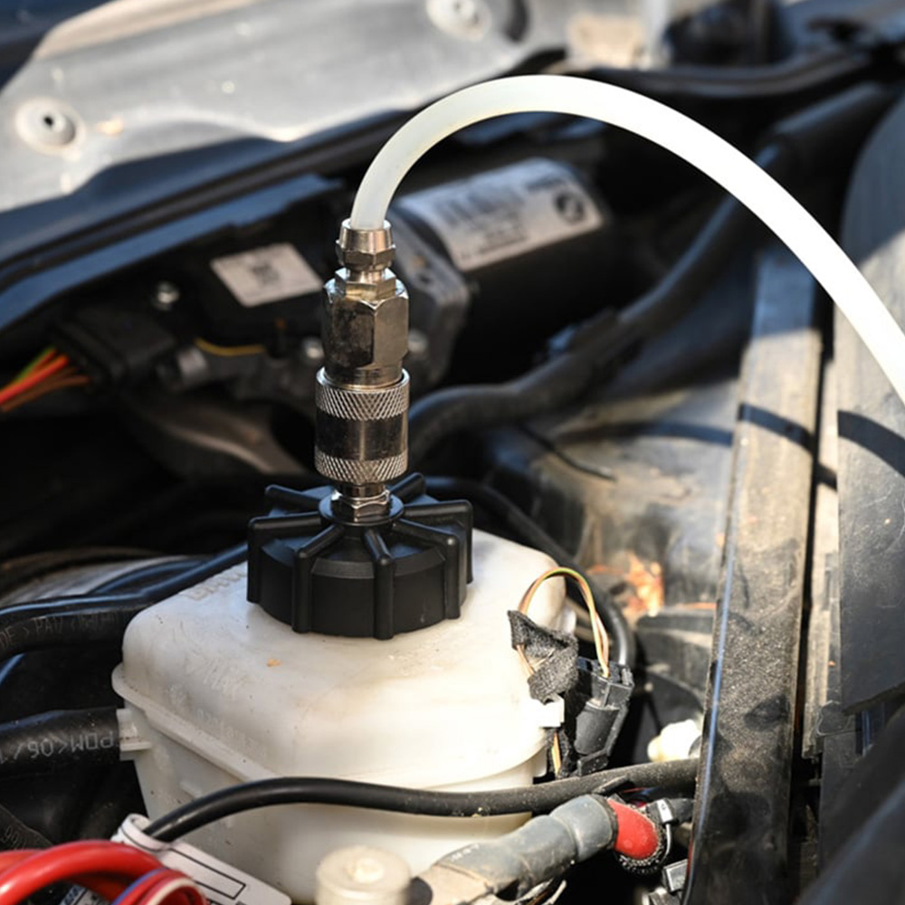 Effortlessly bleed your brakes single-handedly with the Hilka Manual Pressure Brake Bleeder. Suitable for most master cylinders using the Euro adaptor (1-3 inches with a 44mm neck), this tool boasts a 2L reservoir and operates at 10-30psi (pressure gauge included). A quick-connector cap, flexible hose (also with a quick connector), and pressure release valve ensure smooth operation. The package also includes a 1L waste bottle, complete with support chain and a cap tightening tool.