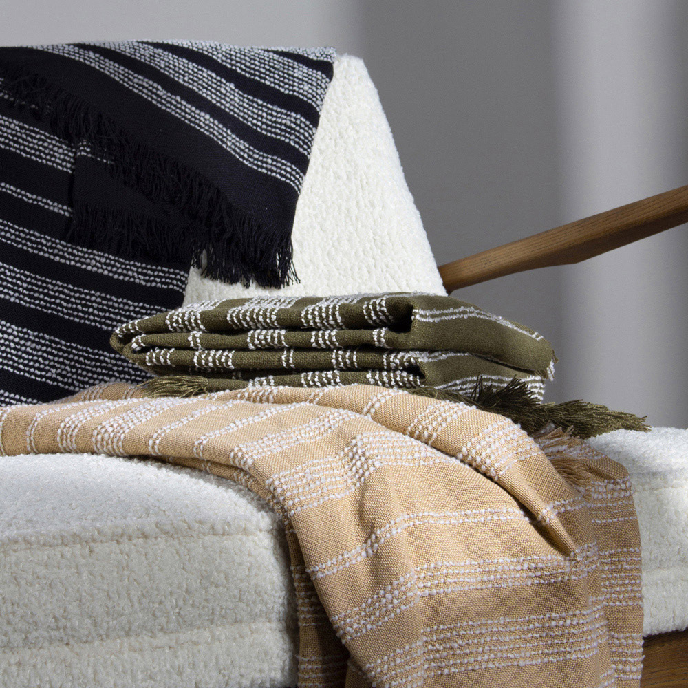 Elevate your living space with the Hoem Jour Nougat Woven Fringed Throw. This super-soft, lightweight, and durable throw features sophisticated linear boucle yarn details, flowing smoothly across the minimalist textured fabric. The four frayed fringed edges create an effortless layered look. Size: 130 x 180cm.