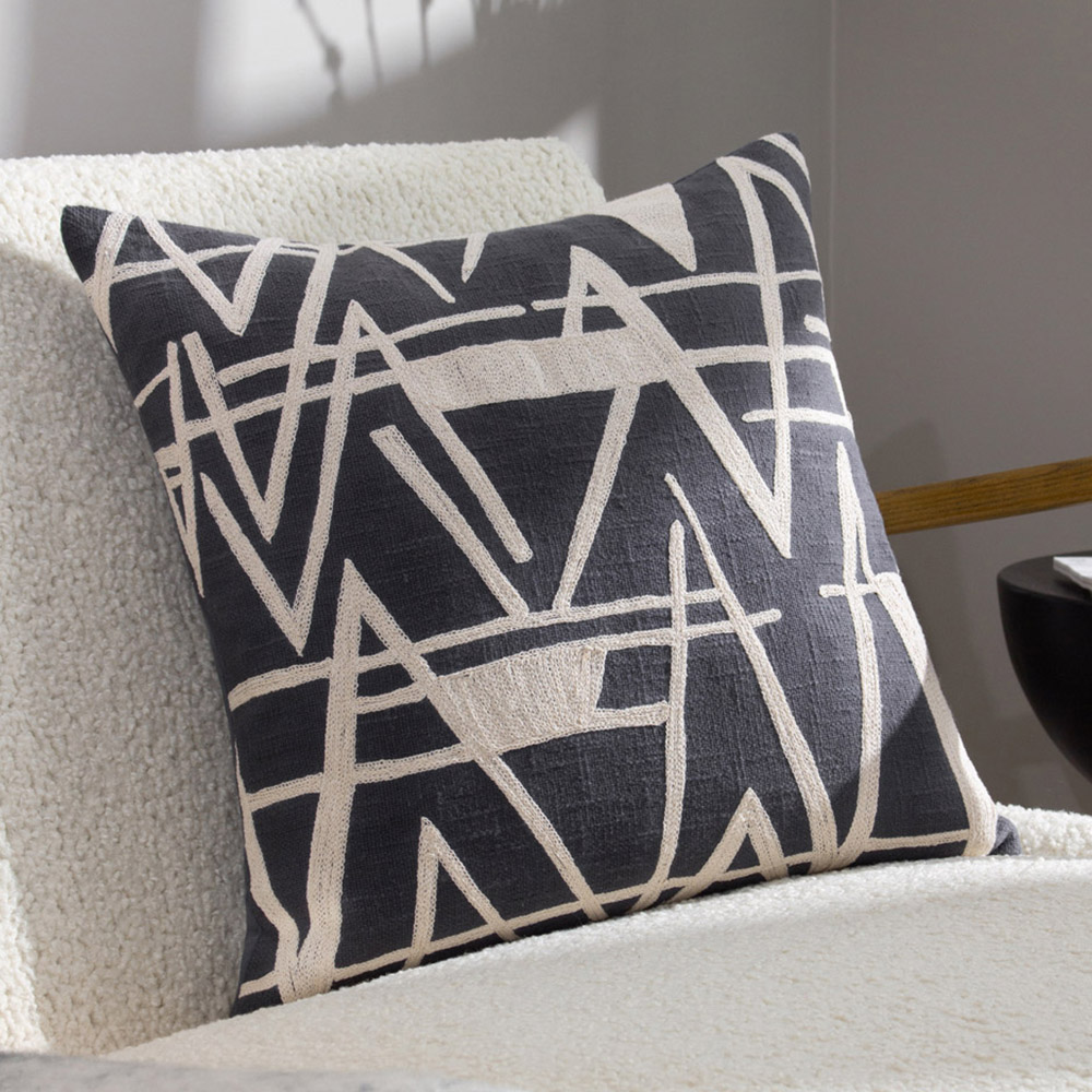 Elevate your space with the Dusk Embroidered Cushion. Its finely embroidered geometric lines, stitched onto a complementing woven cotton face, create a sophisticated abstract pattern perfect for contemporary neutral environments. The cushion's textural design adds a touch of artistry, ideal for layering on your bed or sofa.