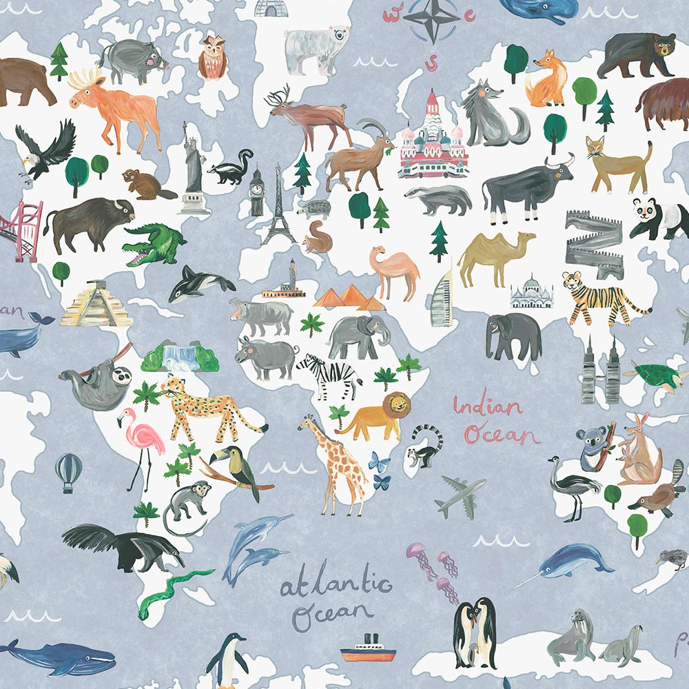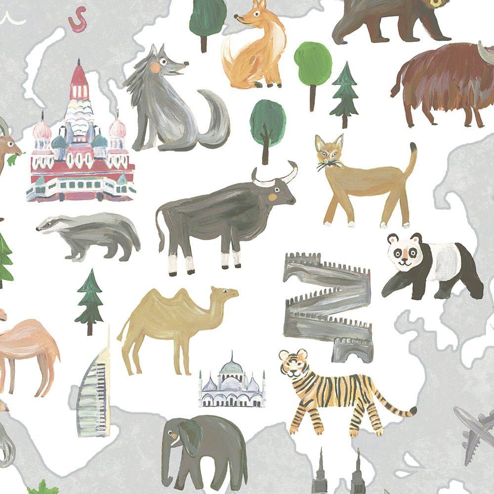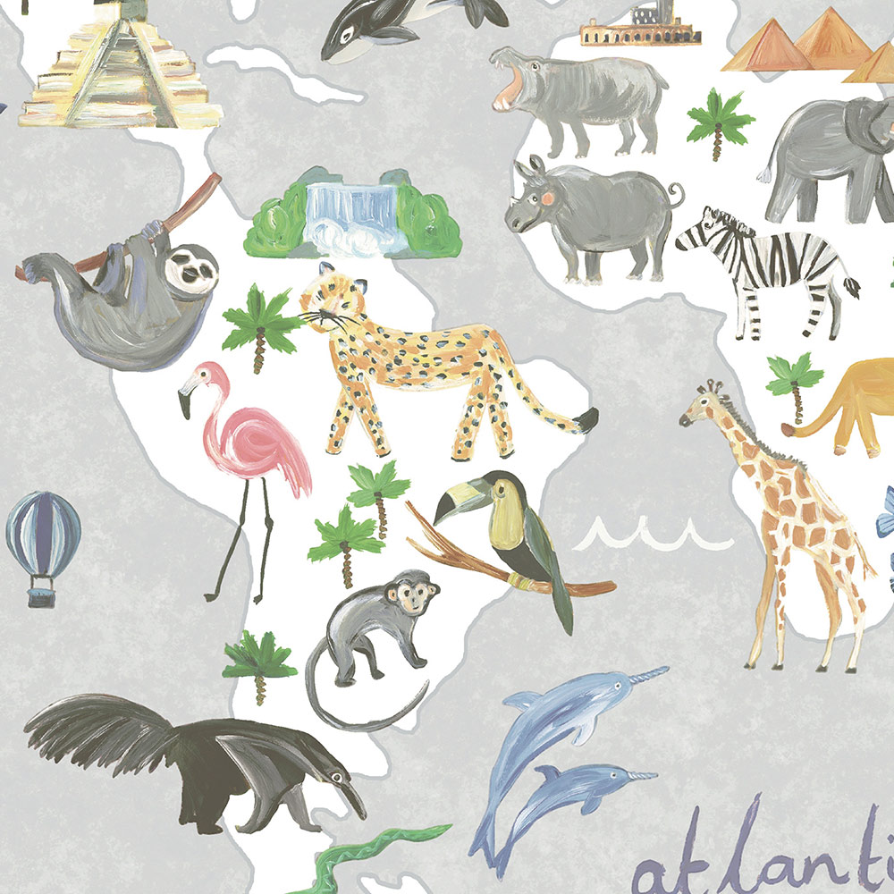 Transform your child',s bedroom with Holden Decor Animal Maps Wallpaper. This FSC-certified wallpaper showcases a colourful world map populated with animals from around the globe. Perfect for any child',s room, it boasts a smooth, spongeable matt finish. Paste-the-paper application is recommended. Each roll measures 10.05m long and 53cm wide, with an offset design match and a 53cm/26.5cm repeat. The wallpaper is available in grey.