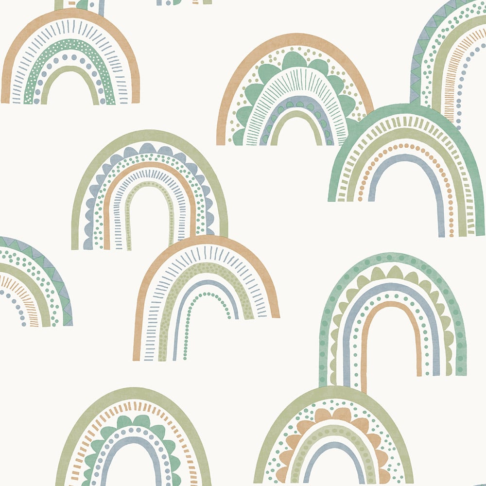 Bring a touch of bohemian charm to your child',s space with Holden Decor Boho Rainbow Wallpaper. This FSC-certified wallpaper showcases vibrant rainbow arches in a delightful mix of scallop, spot, and stripe patterns. The smooth, matt, spongeable finish is easy to clean. Paste-the-paper application simplifies installation. Each roll measures 10.05m long and 53cm wide, with an offset match and 53cm/26.5cm repeat. The refreshing green/teal colourway adds a calming touch.