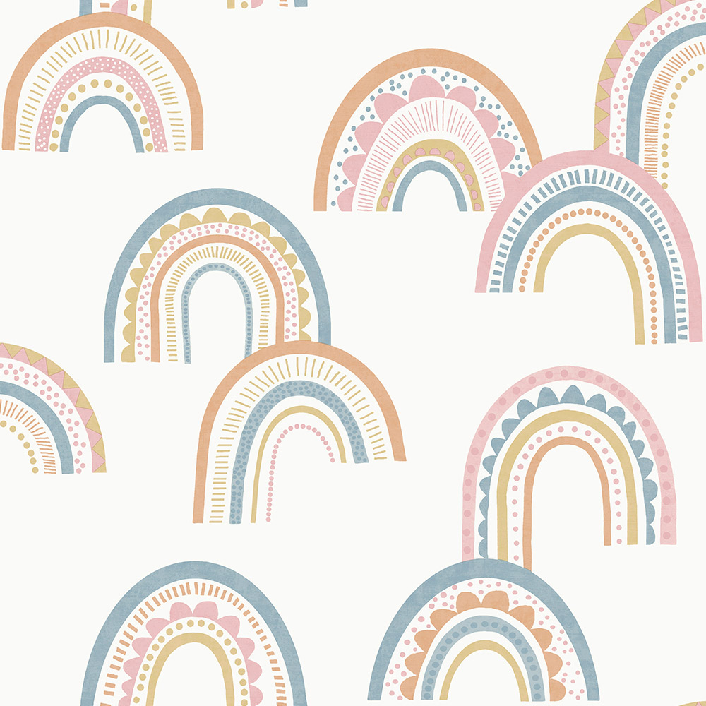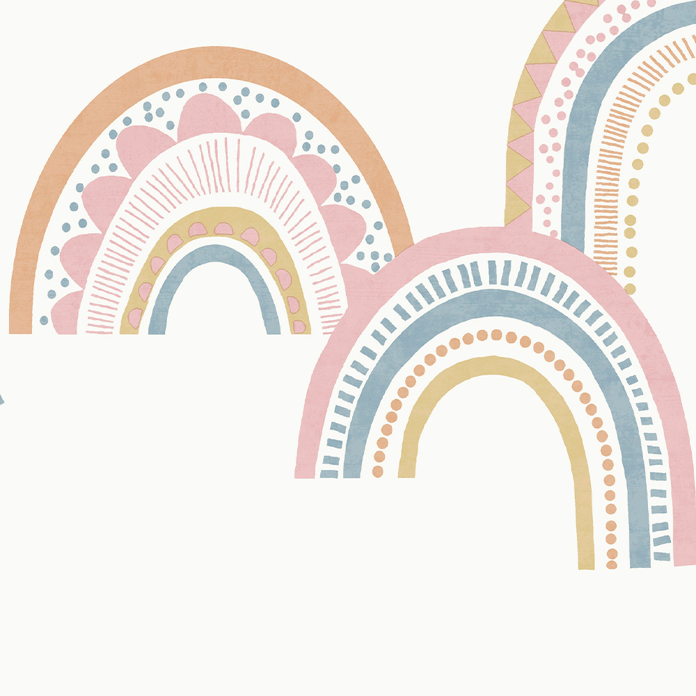 Transform your child',s bedroom with Holden Decor Boho Rainbow Wallpaper. This FSC-certified wallpaper features vibrant rainbow arches in a captivating mix of scallop, spot, and stripe patterns. The smooth, matt, spongeable surface is easy to clean. Paste-the-paper application makes installation simple. Each roll is 10.05m long and 53cm wide, with an offset match and 53cm/26.5cm repeat. The colours are orange, pink, and blue.